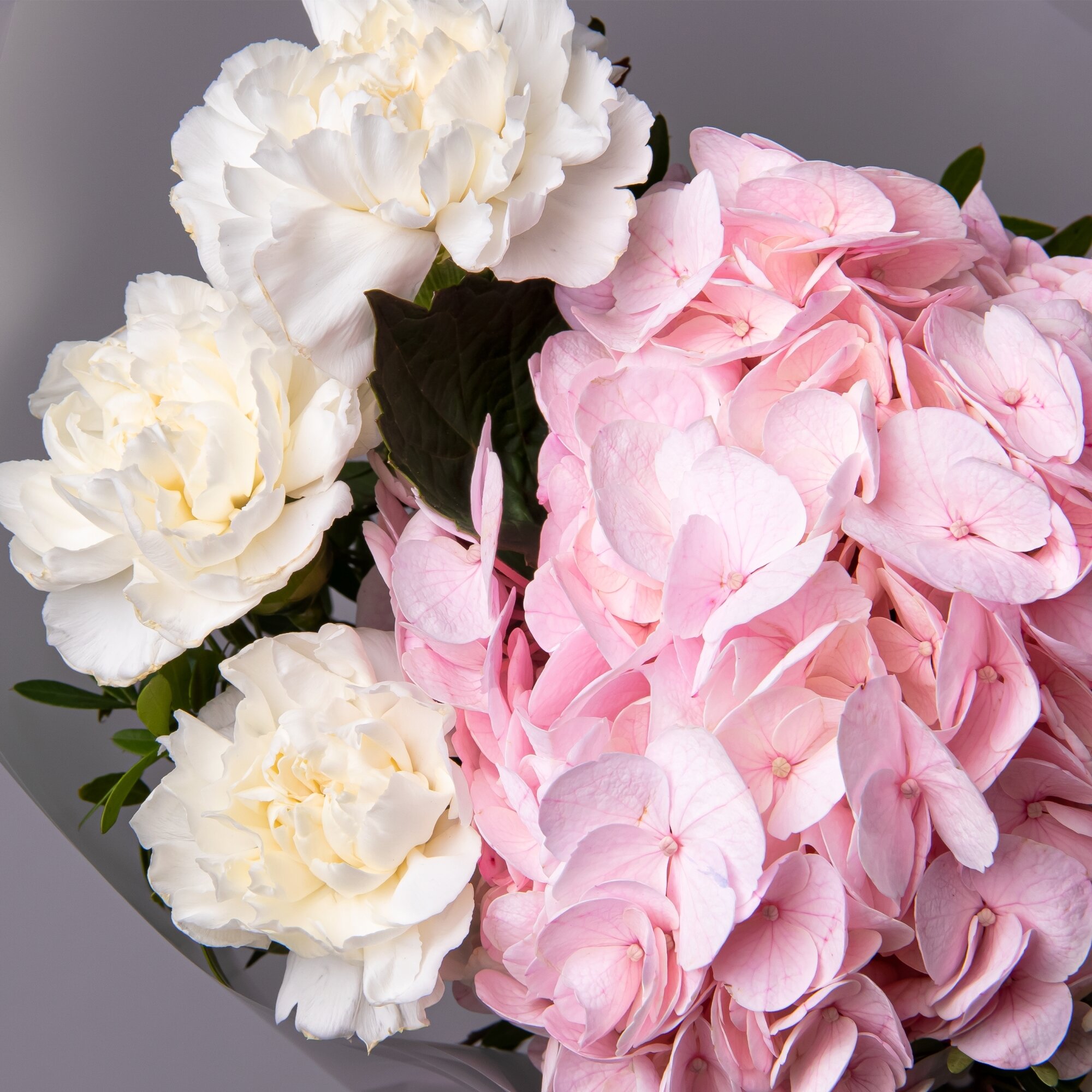 10 цен на Дуобукет из розовой гортензии и белых диантусов в коробке и аквабоксе от Простоцветы