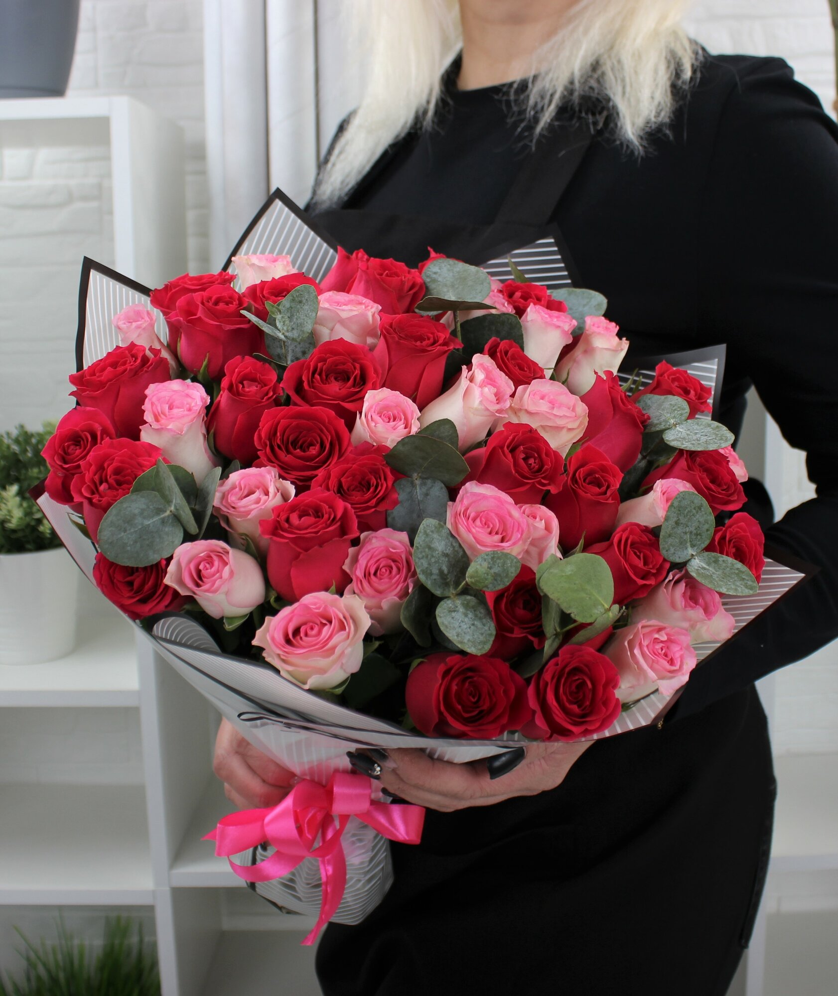10 цен на 51 малиновая и бело-розовая роза 40см с эвкалиптом