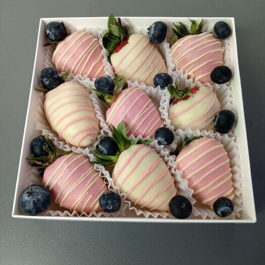 Характиристики этого товара не найдены!Отзывы на Клубника в белом шоколаде в бело- розовых тонах с голубикой 9 - 12 ягод