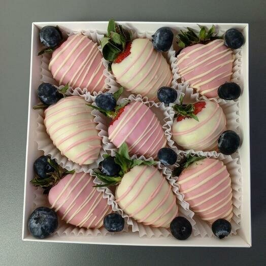 10 цен на Клубника в белом шоколаде в бело- розовых тонах с голубикой 9 - 12 ягод