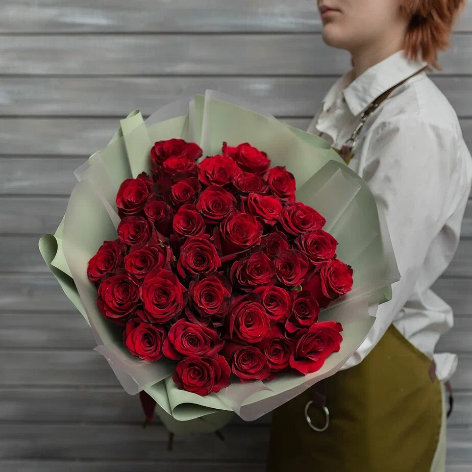 10 цен на Букет живых цветов из 35 красных роз в упаковке Эквадор 60 см