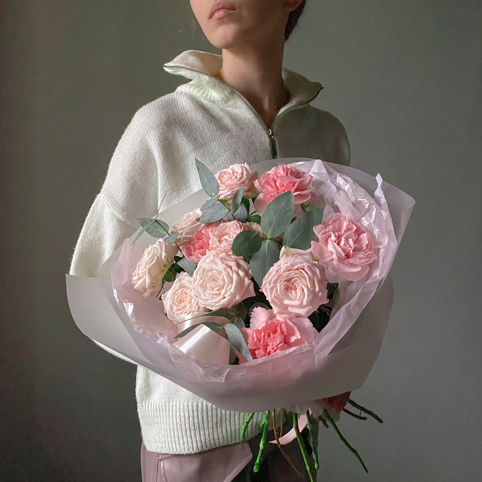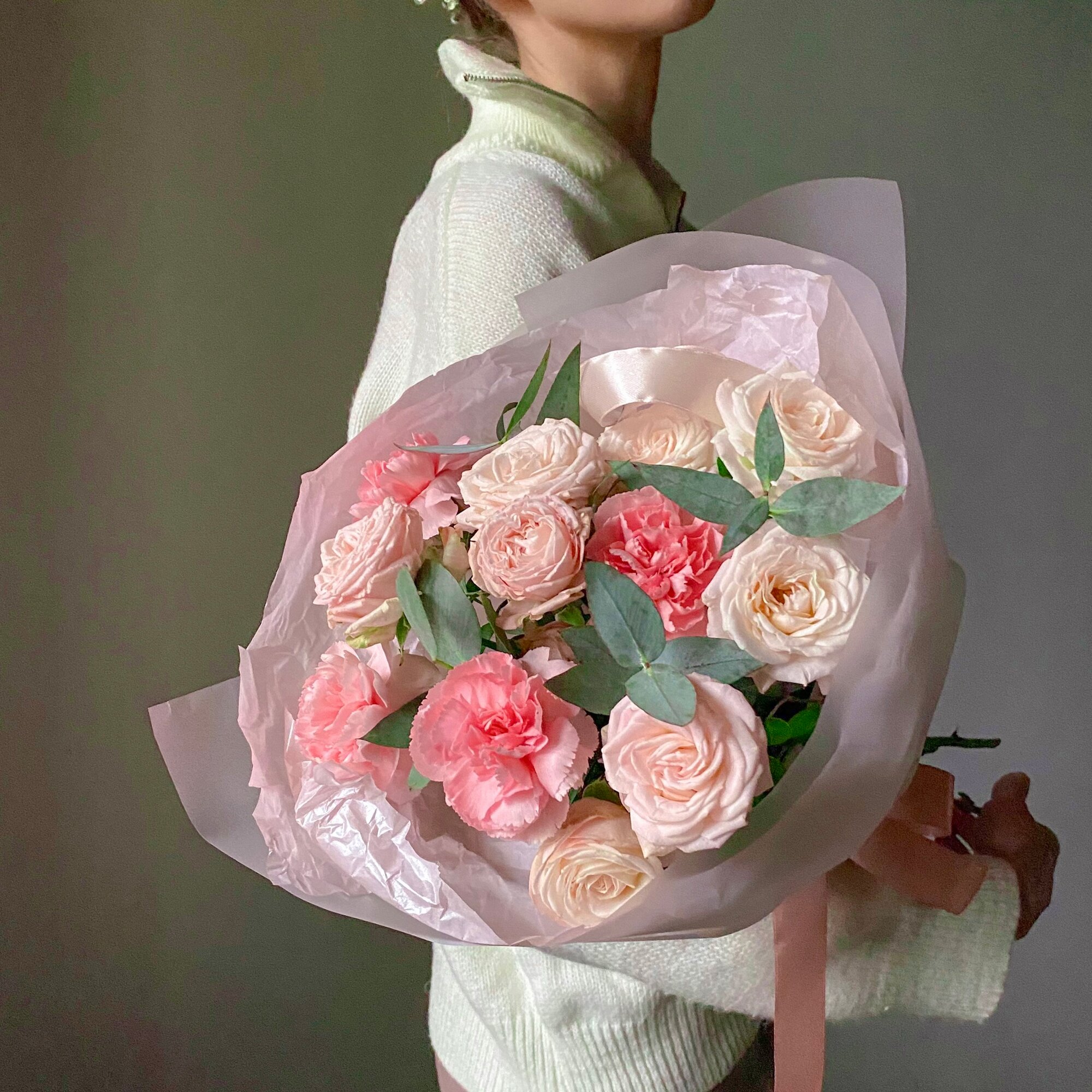 10 цен на Нежный букет с пионовидными розами, эвкалиптом и диантусами в авторской упаковке