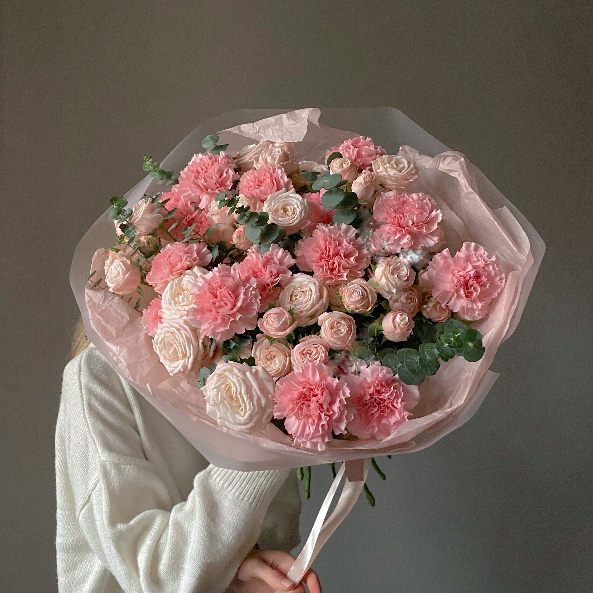 10 цен на Нежный букет с пионовидными розами и диантусами в авторской упаковке. Размер L