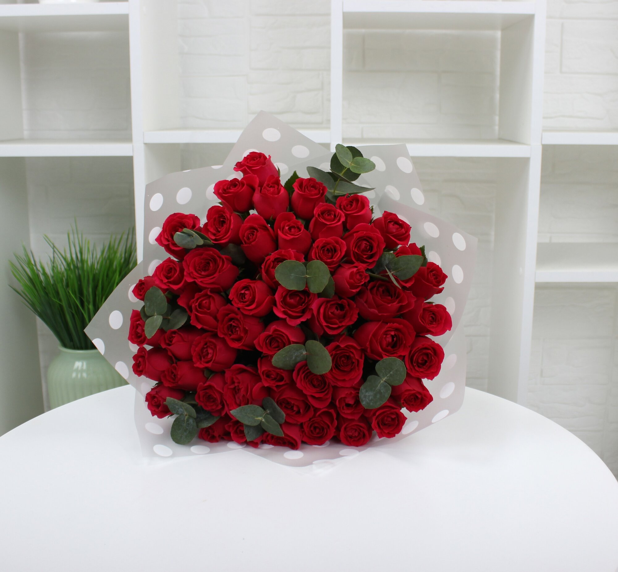 10 цен на 51 малиновая роза 40см с эвкалиптом