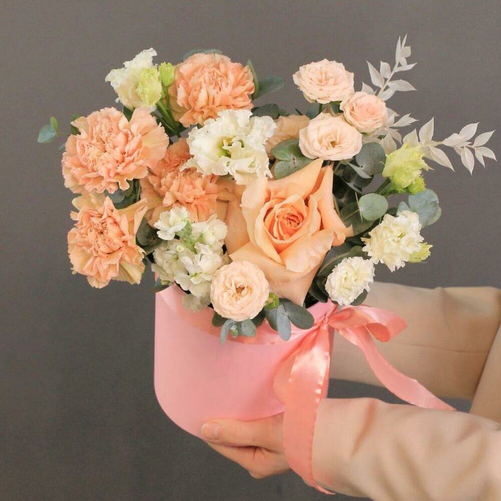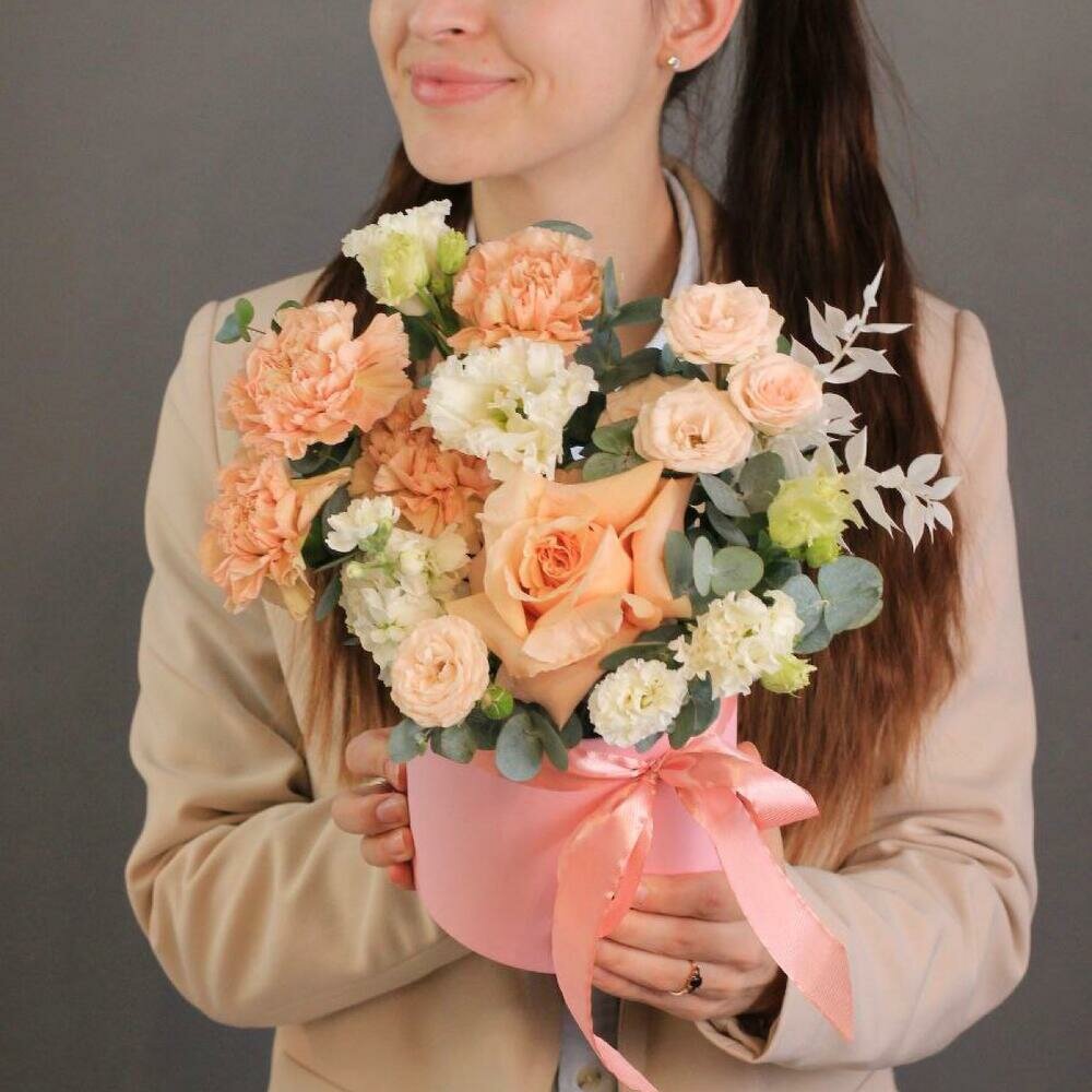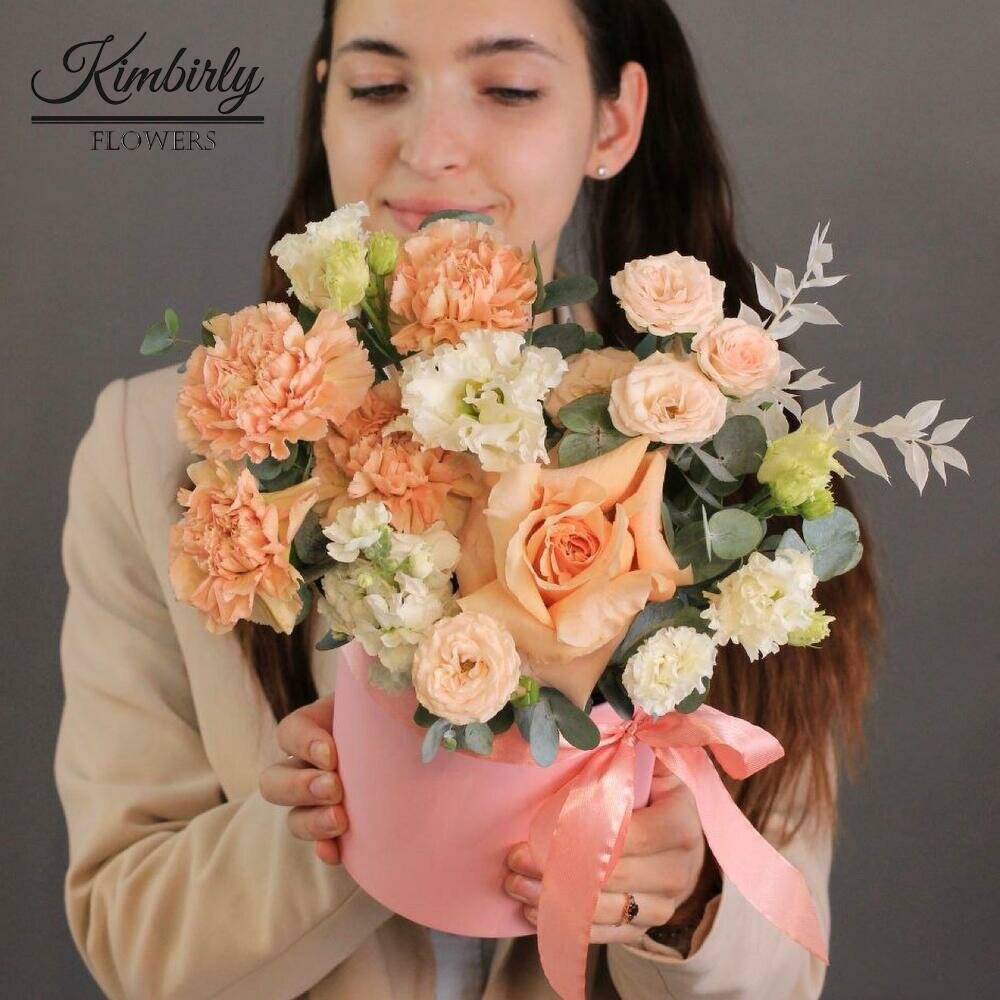 10 цен на Букет цветов от Kimbirly Flowers в коробке из французской и кустовой розы, эустомы, гвоздики, маттиолы, цвет персиковый