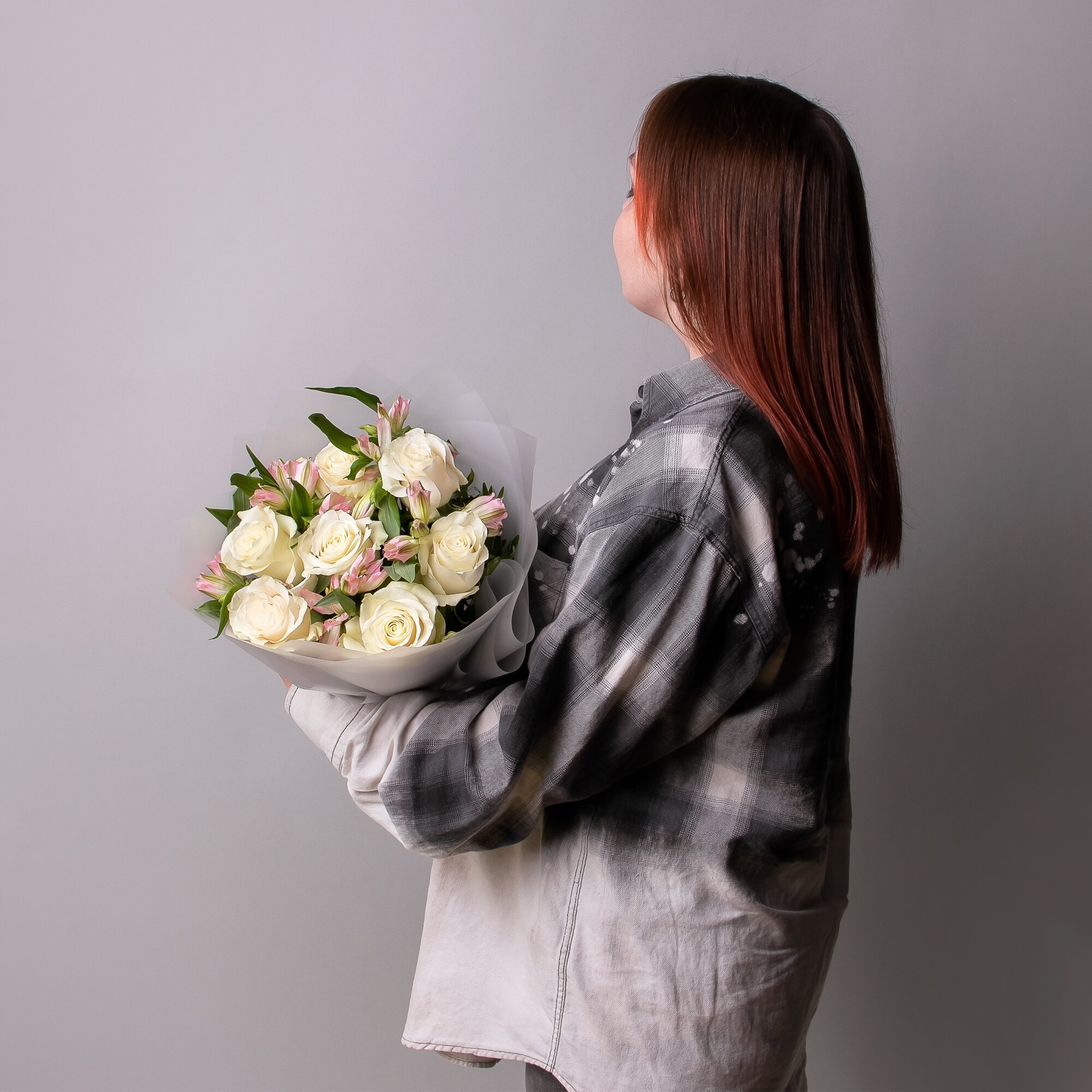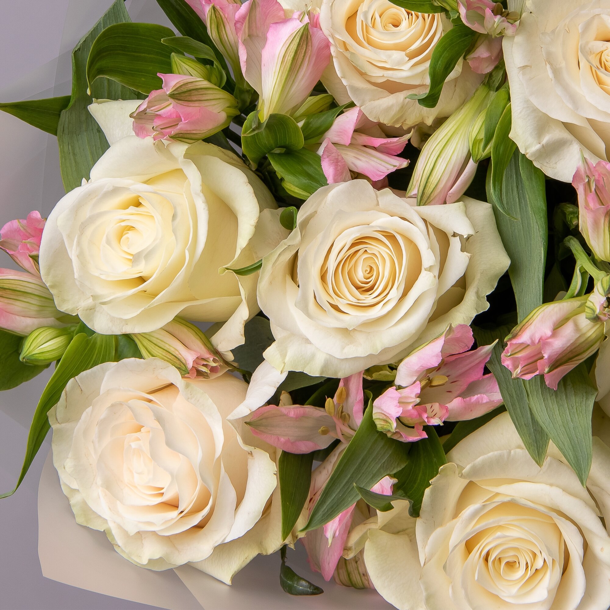 10 цен на Дуобукет из белой розы и розовой альстромерии в коробке и аквабоксе от Простоцветы