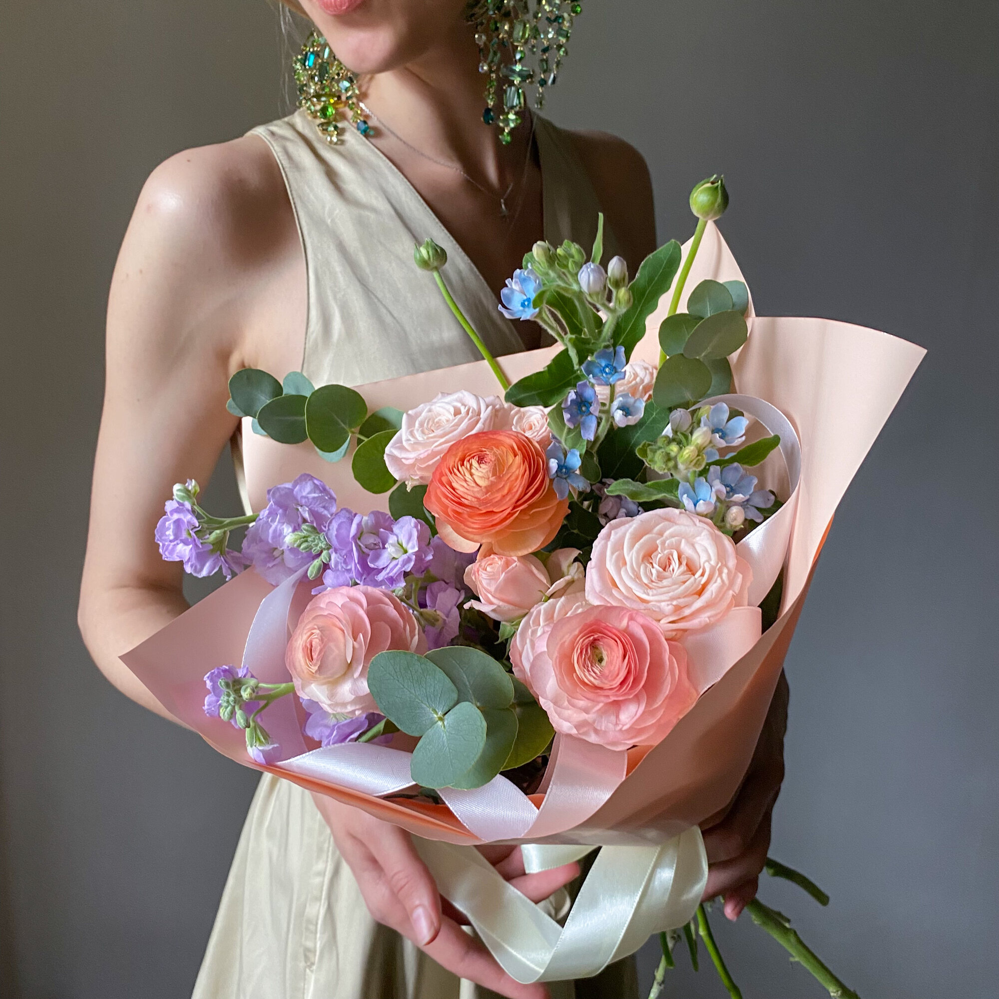 10 цен на Авторский букет с персиковыми ранункулюсами, маттиолой и незабудками. Размер S