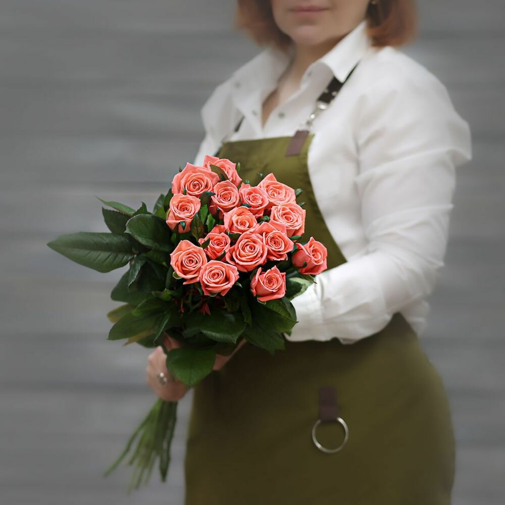 10 цен на Букет живых цветов из 17 коралловых роз (Россия) с лентой 60 см