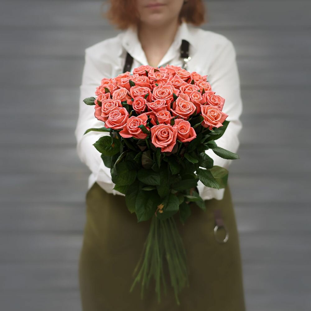 10 цен на Букет живых цветов из 31 коралловой розы (Россия) с лентой 60 см