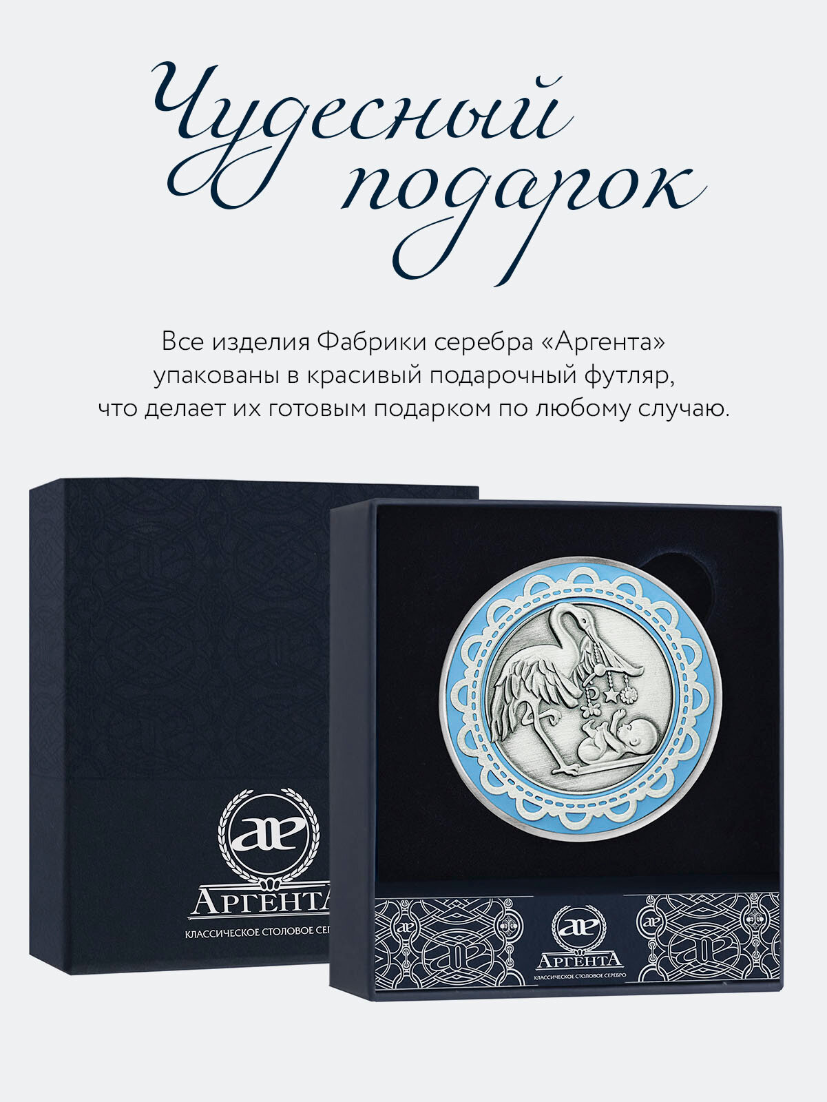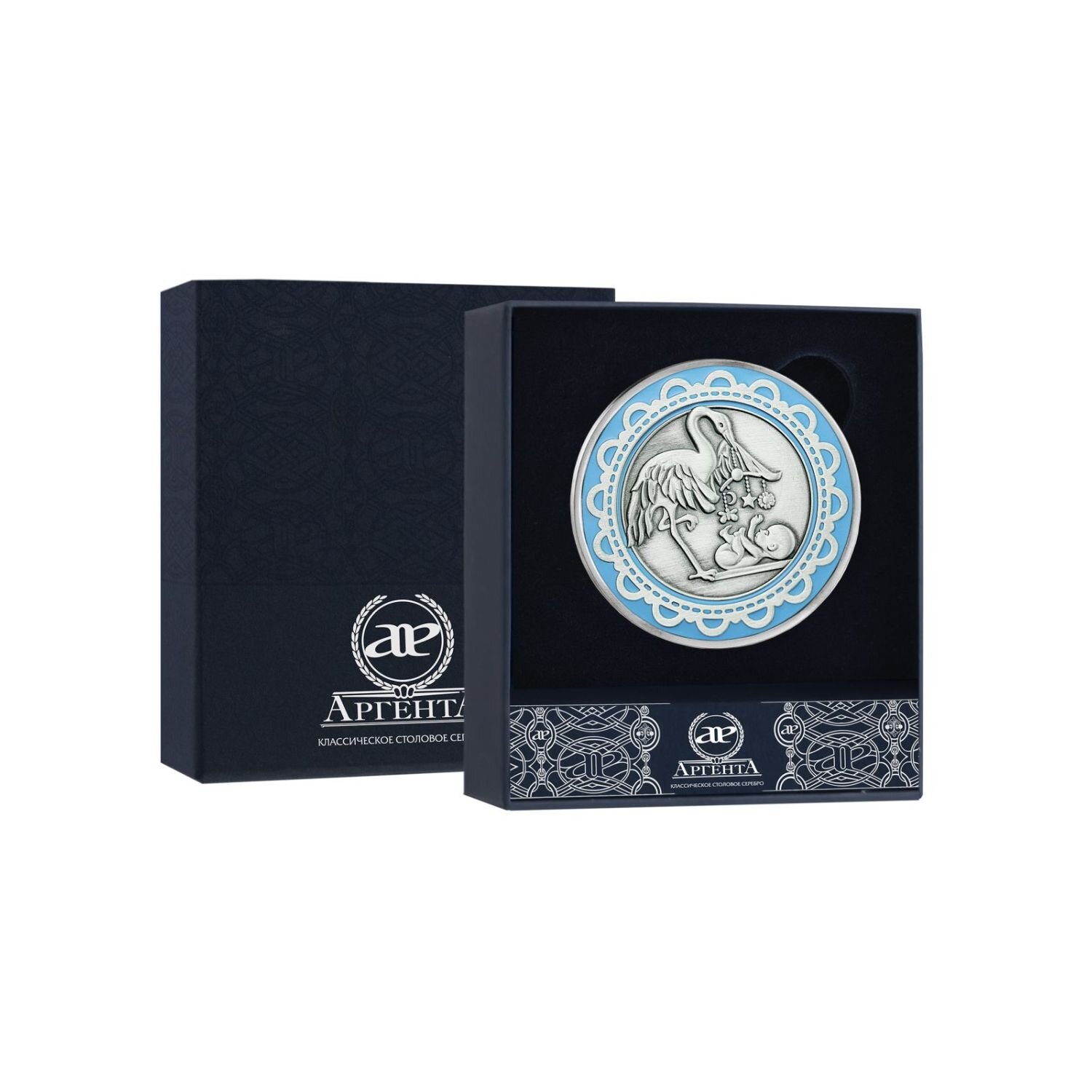 10 цен на Медаль серебряная "С рождением" с чернением и голубой эмалью в футляре