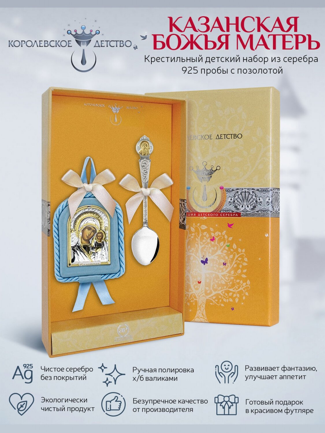 Набор крестильный подарочный "Казанская Божья матерь" 2 предмета для мальчика в футляре информация: