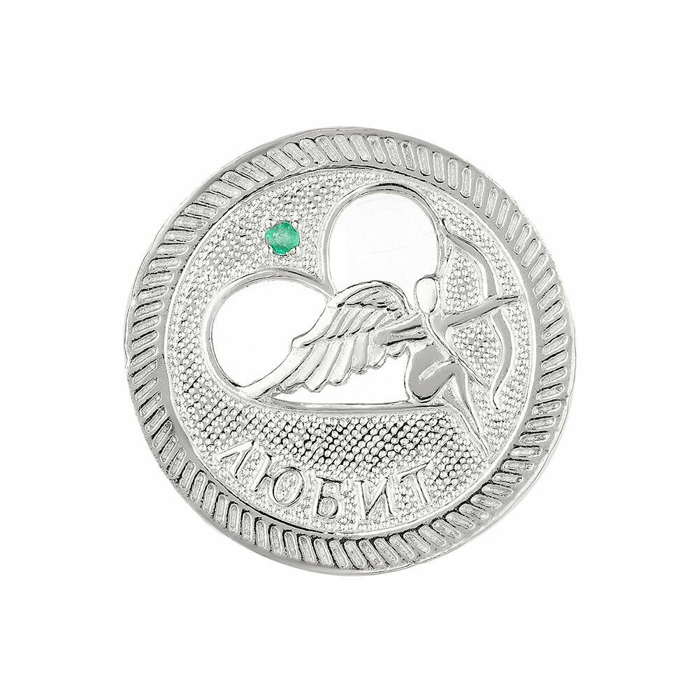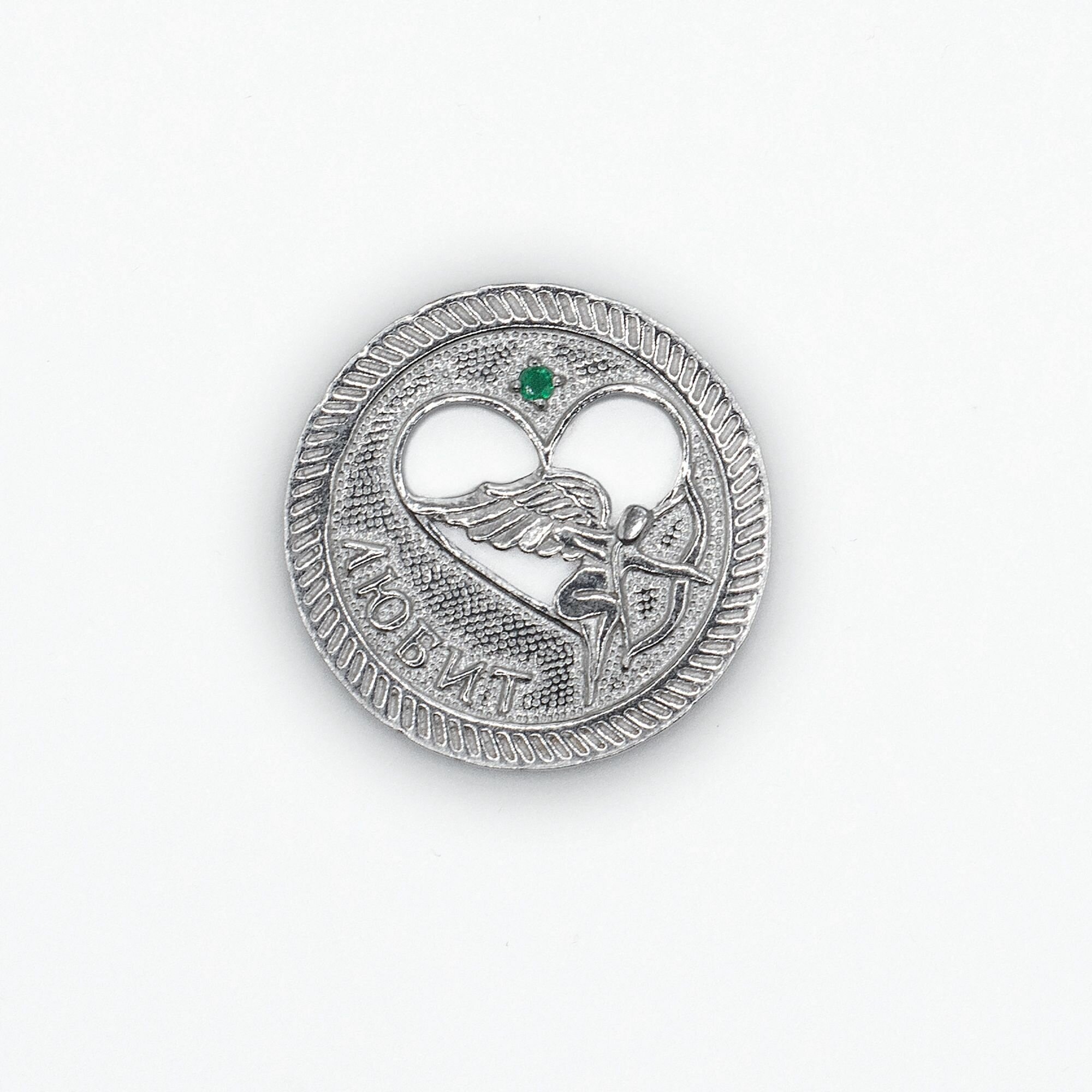 Сувенир ювелирный из серебра 925 пробы монета на удачу с натуральным изумрудом информация: