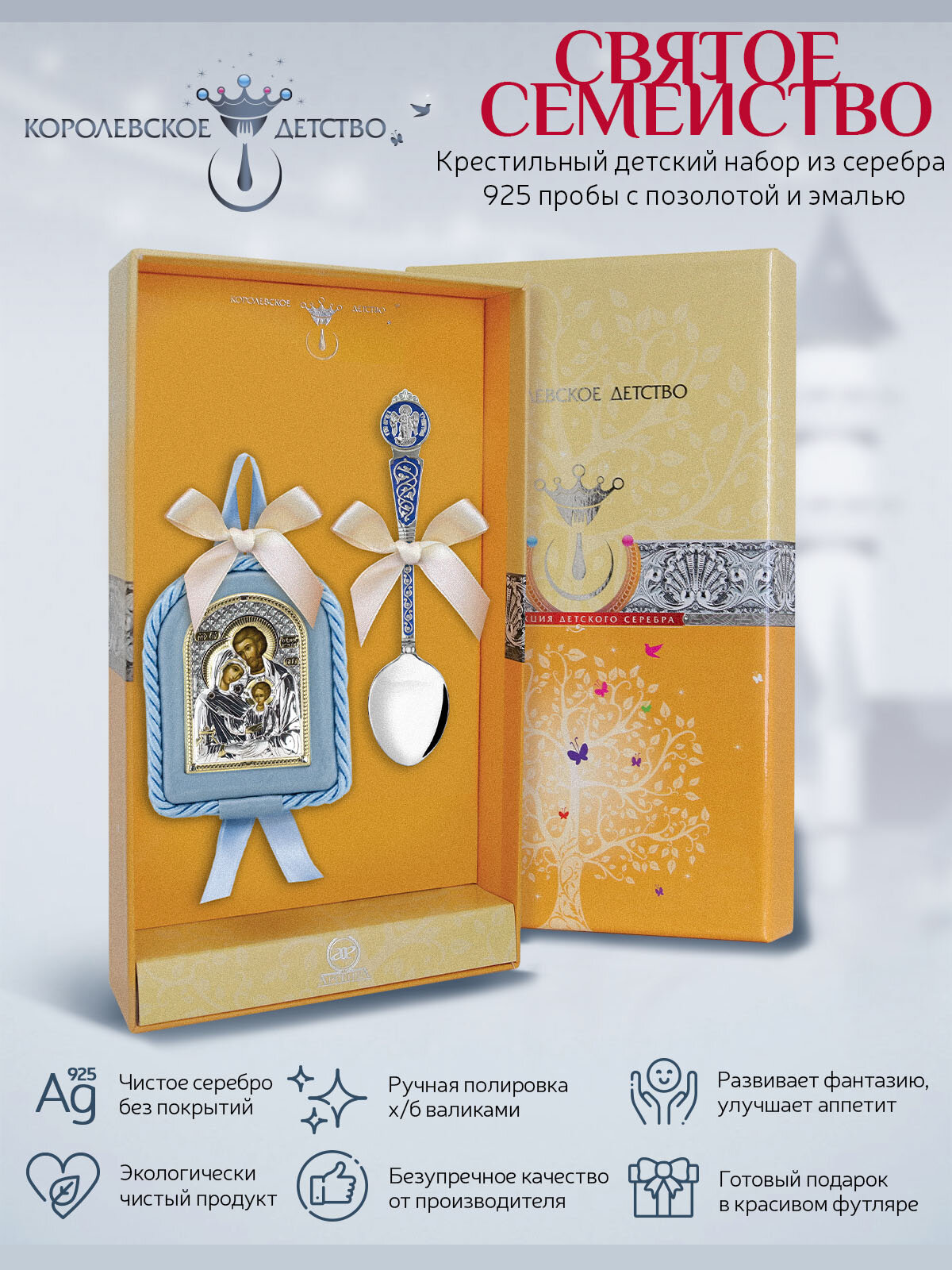 Набор крестильный подарочный "Святое Семейство" для мальчика 2 предмета в футляре информация: