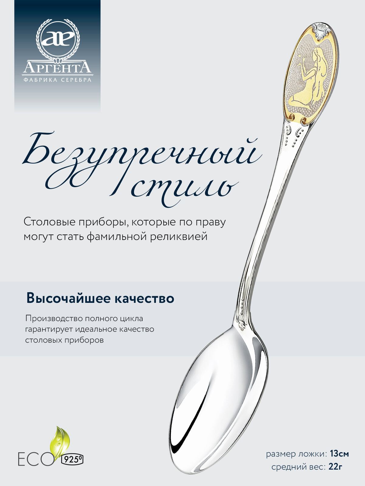 Серебряная чайная ложка с логотипом "Дева" с позолотой от бренда "Аргента" информация: