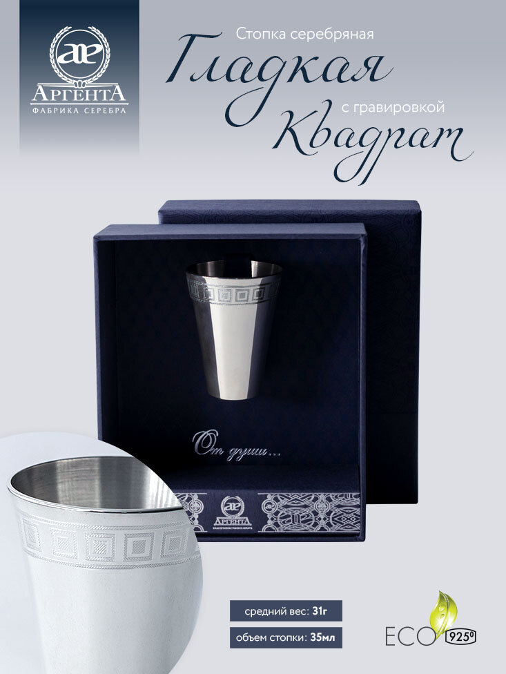 Стопка серебряная гладкая с рисунком "Квадрат" в футляре, 35 мл информация: