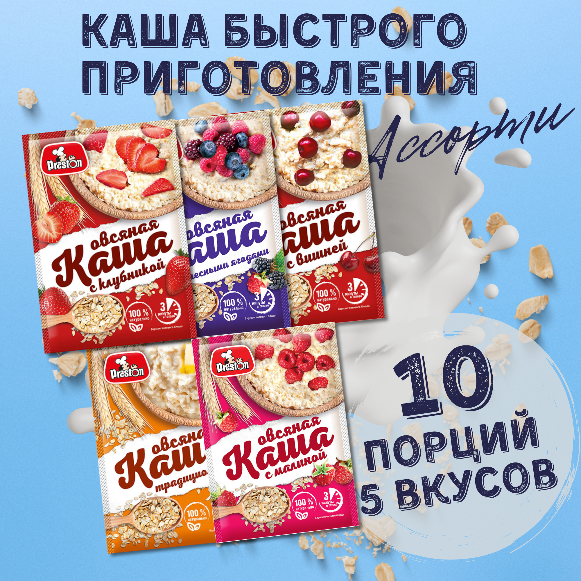 10 цен на Каша овсяная быстрого приготовления Preston, в пакетиках 37 г, Ассорти 5 вкусов, 10 шт.
