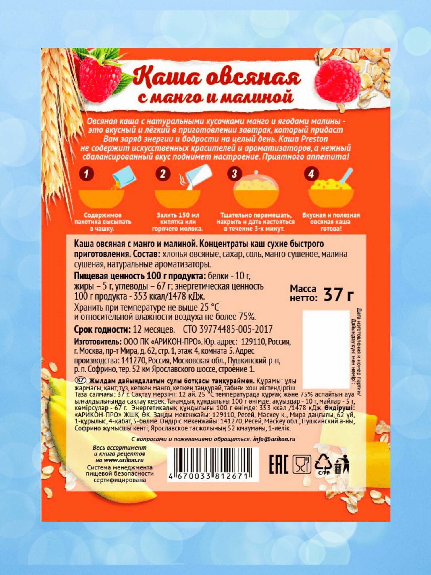 Каша овсяная быстрого приготовления Preston манго-малина, в пакетиках 37 г х 30 шт. информация: