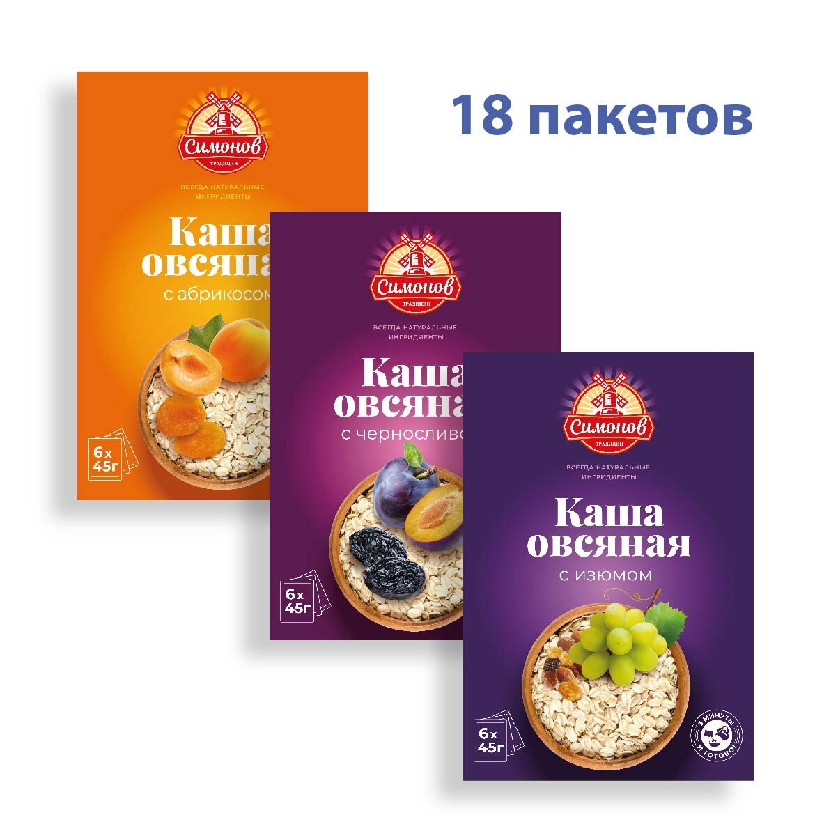 Каша овсяная быстрого приготовления Симонов традиции ассорти (абрикос, чернослив, изюм), порционная, 18 пакетиков по 45 грамм информация: