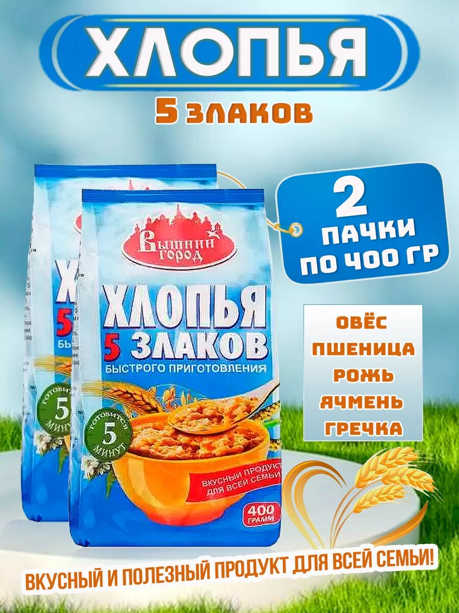 10 цен на Хлопья "Вышний город" 5 злаков , овсяные, гречневые, без добавок, 2 пакета по 400 г