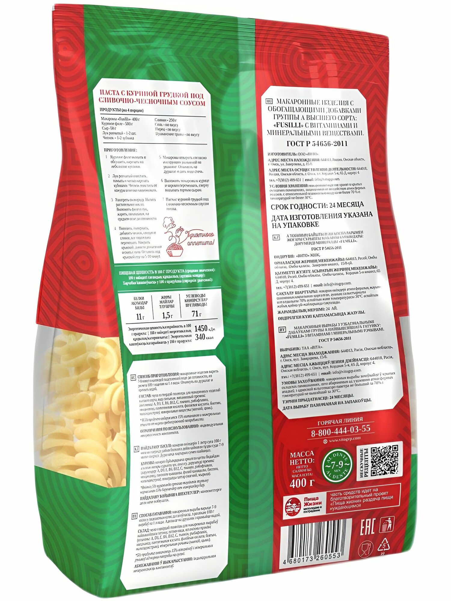 ЛАПША VIA PASTA FUSILLI , НАБОР 8 ШТ. по 400 г, спирали, с обогащающими добавками и минеральными веществами, Россия 1 197 ₽