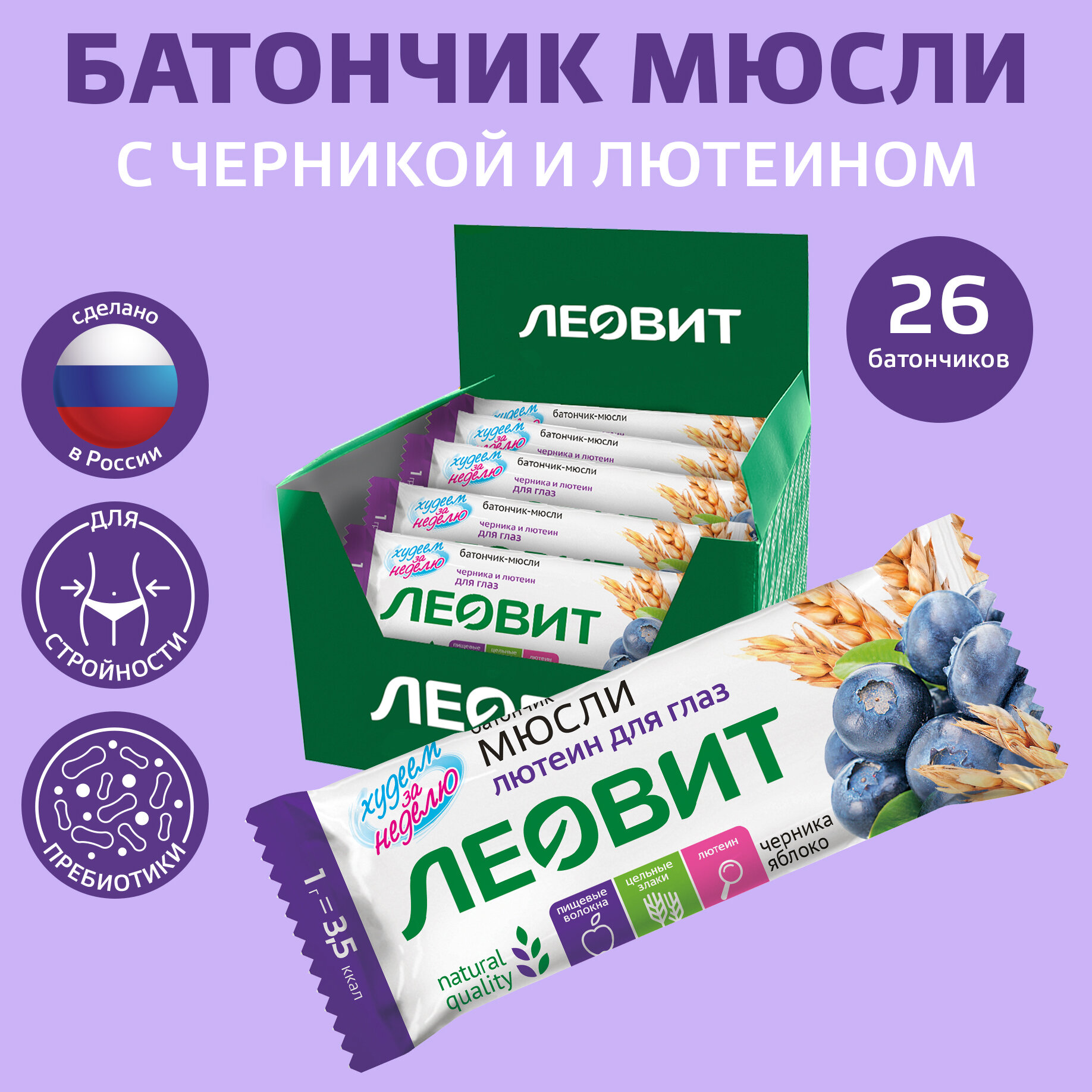 10 цен на Злаковые батончики с черникой и лютеином Худеем за неделю от ЛЕОВИТ мюсли Шоубокс 26 шт по 30 г
