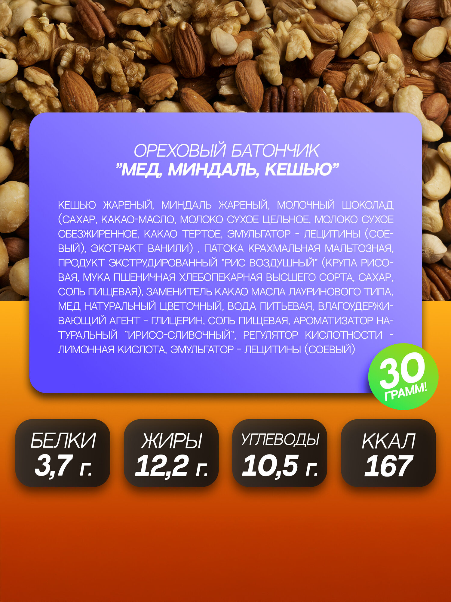 SOJ Nut bar mini, Протеиновые батончики, Мед миндаль кешью с шоколадом и соленой карамелью, 20 шт по 30г информация: