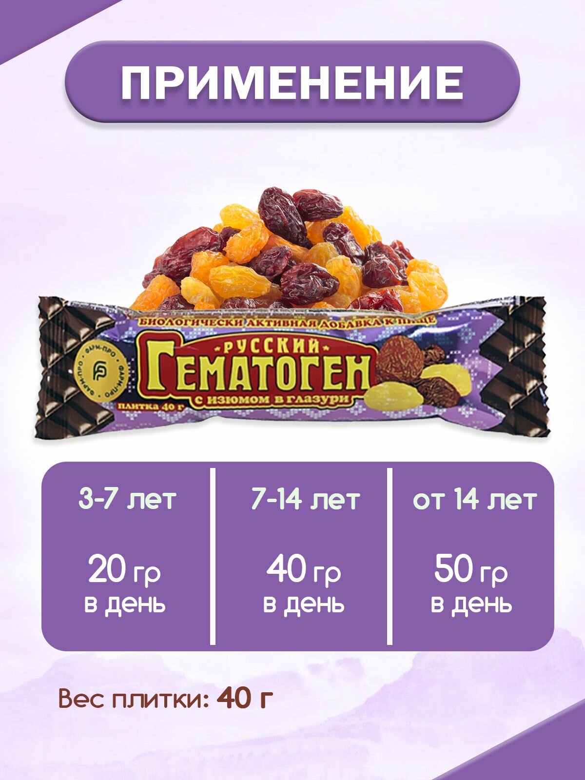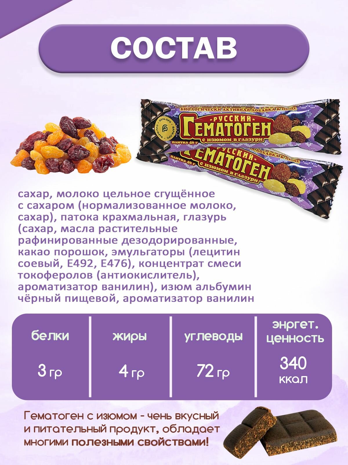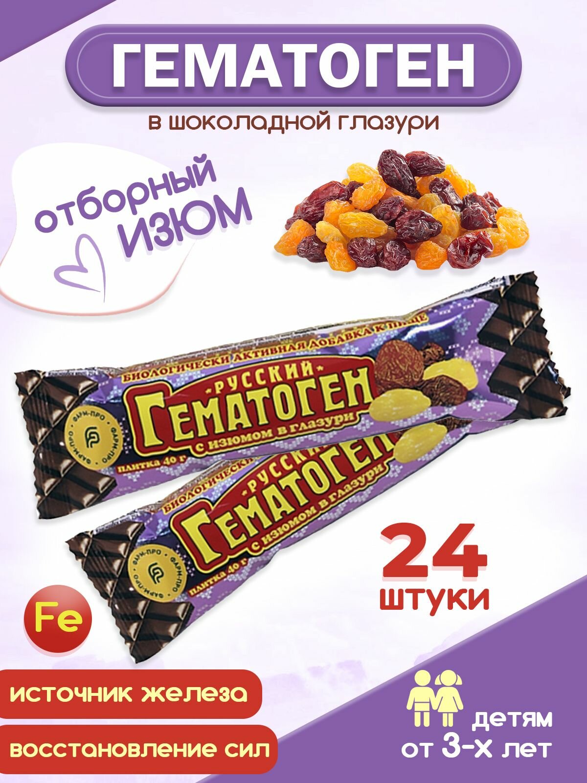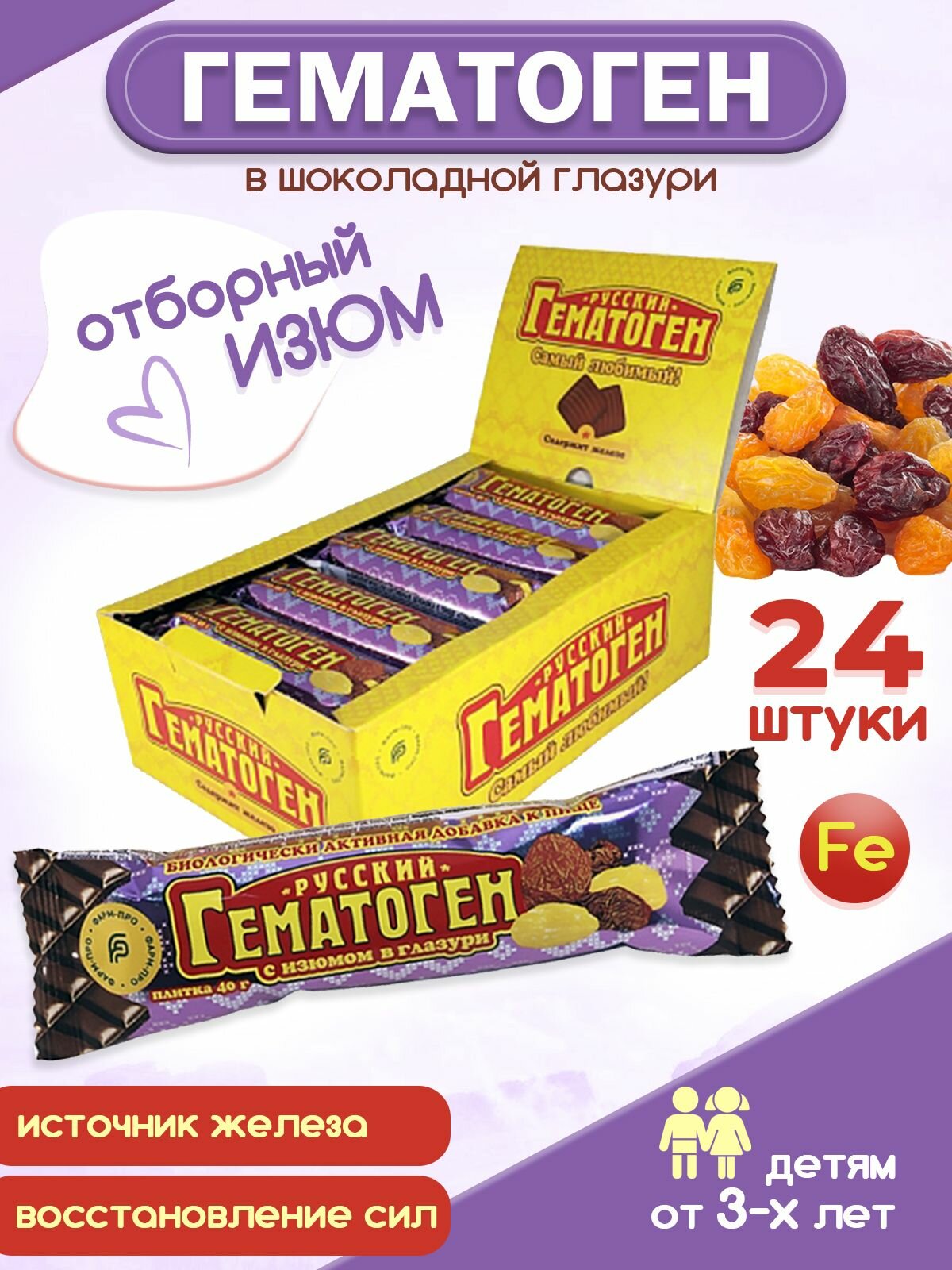 Гематоген Русский (шоколадная глазурь, изюм) 40 г (в наборе 24 шт.) информация: