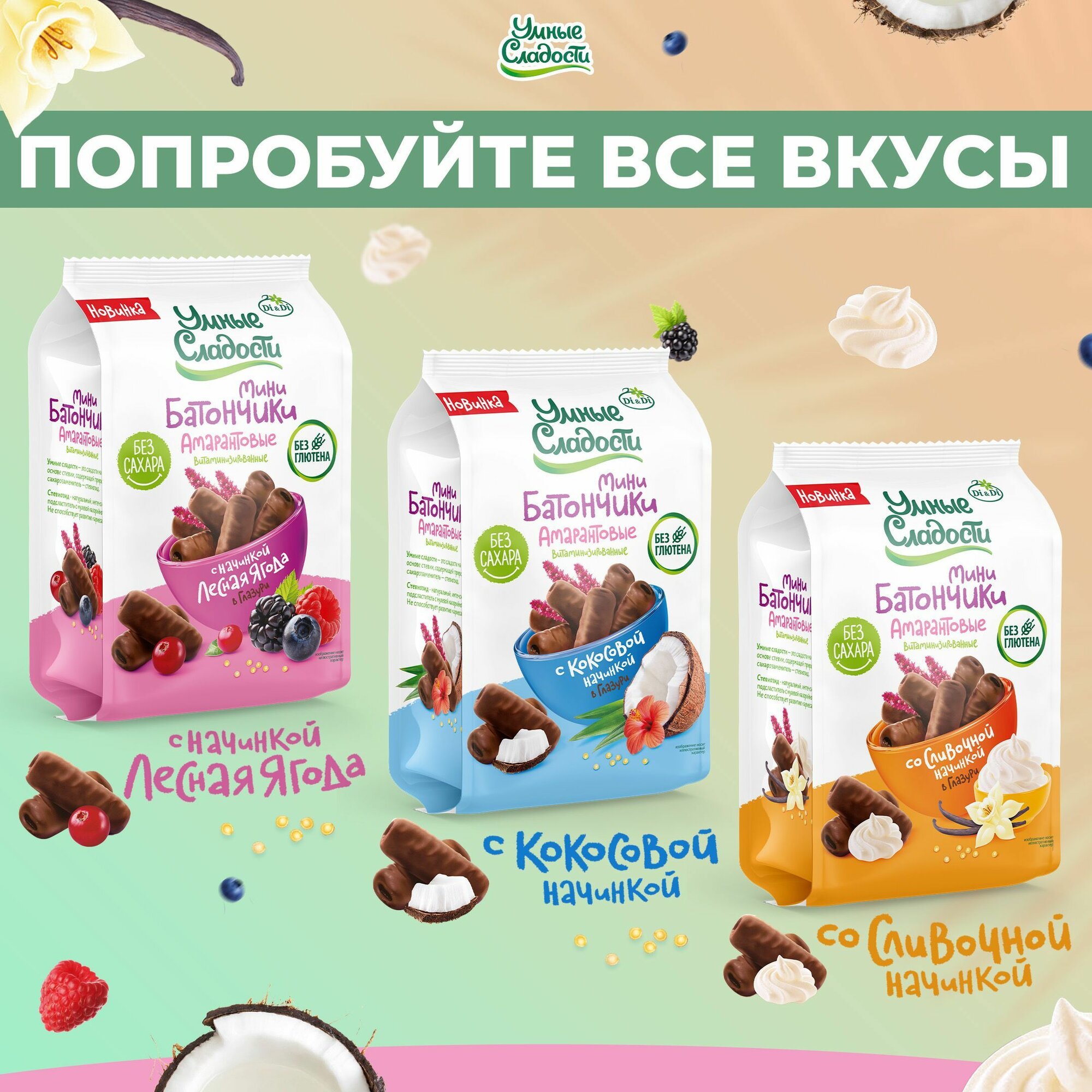 Мини-батончики без сахара и глютена "Умные Сладости" с кокосовой начинкой в глазури, 3шт по 110г информация:
