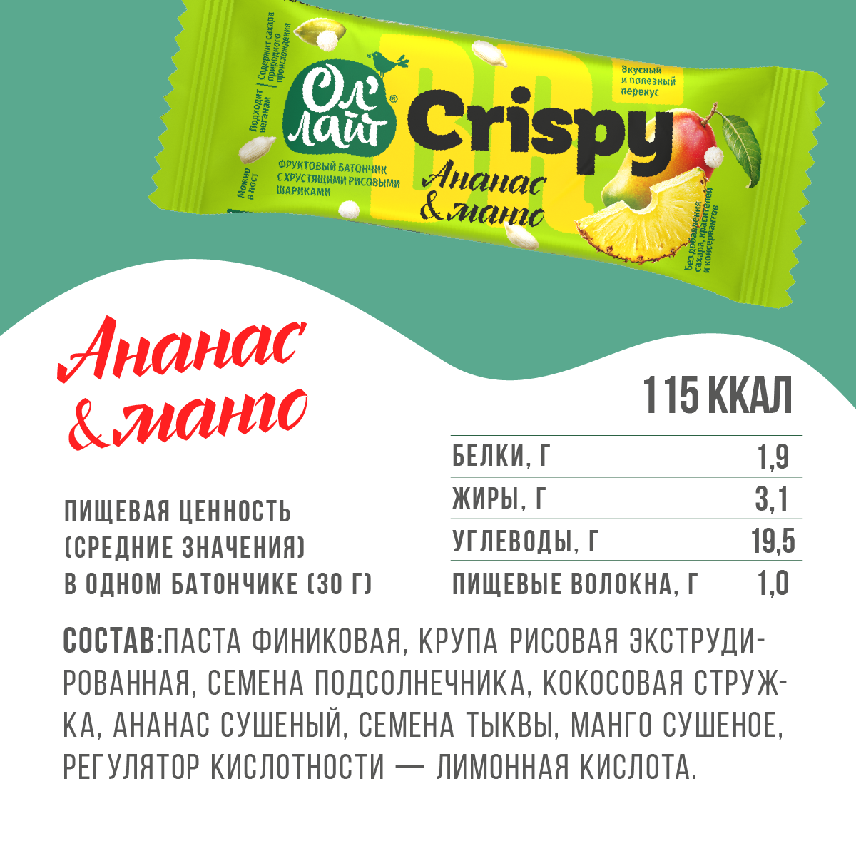 Фруктовый батончик с хрустящими рисовыми шариками и тропическими фруктами, без добавления сахара информация: