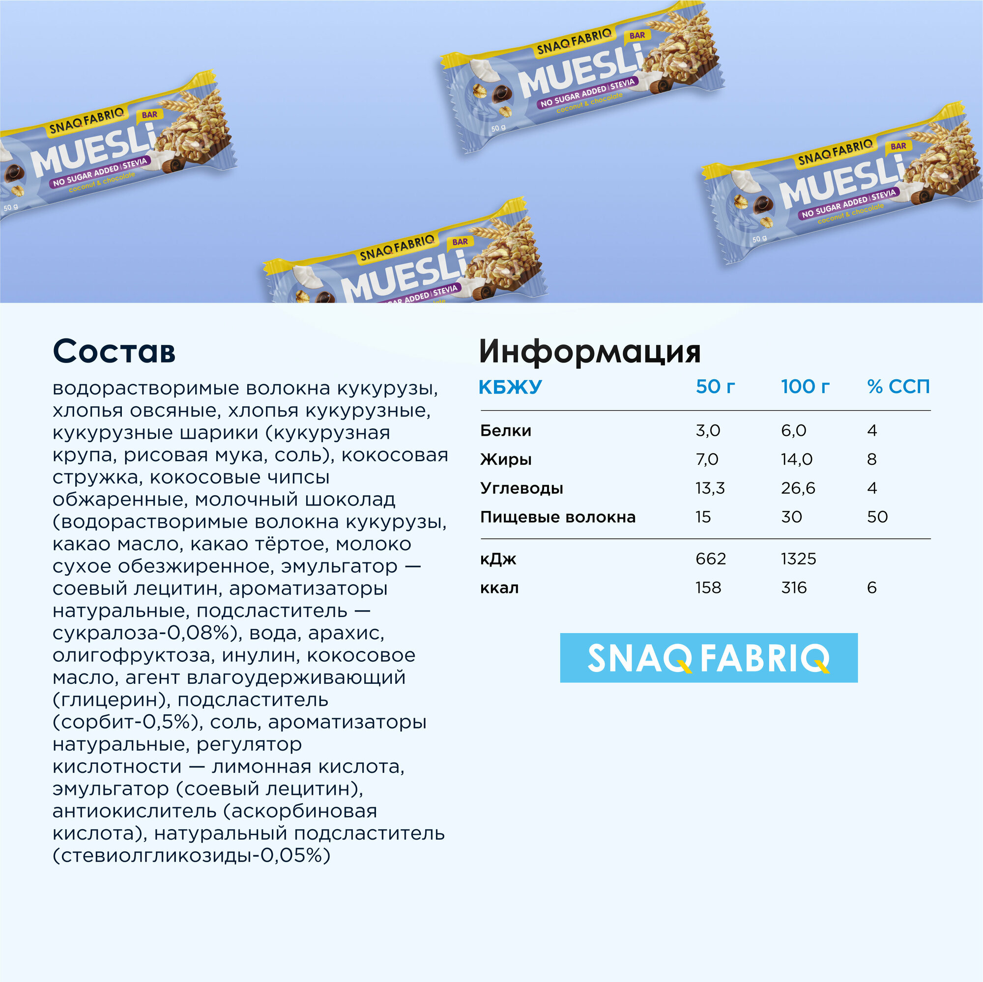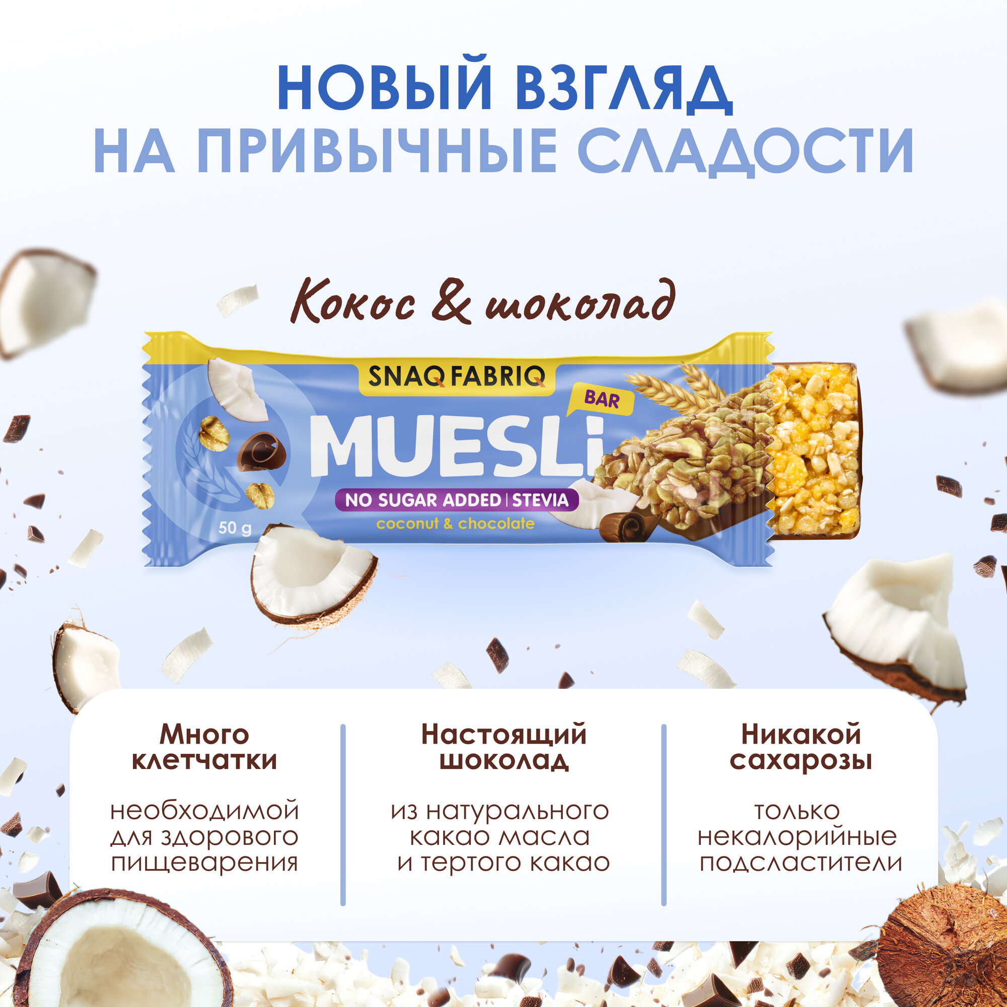 Батончики мультизлаковые в шоколаде без сахара SNAQ FABRIQ Мюсли с кокосом, 12шт х 50г информация: