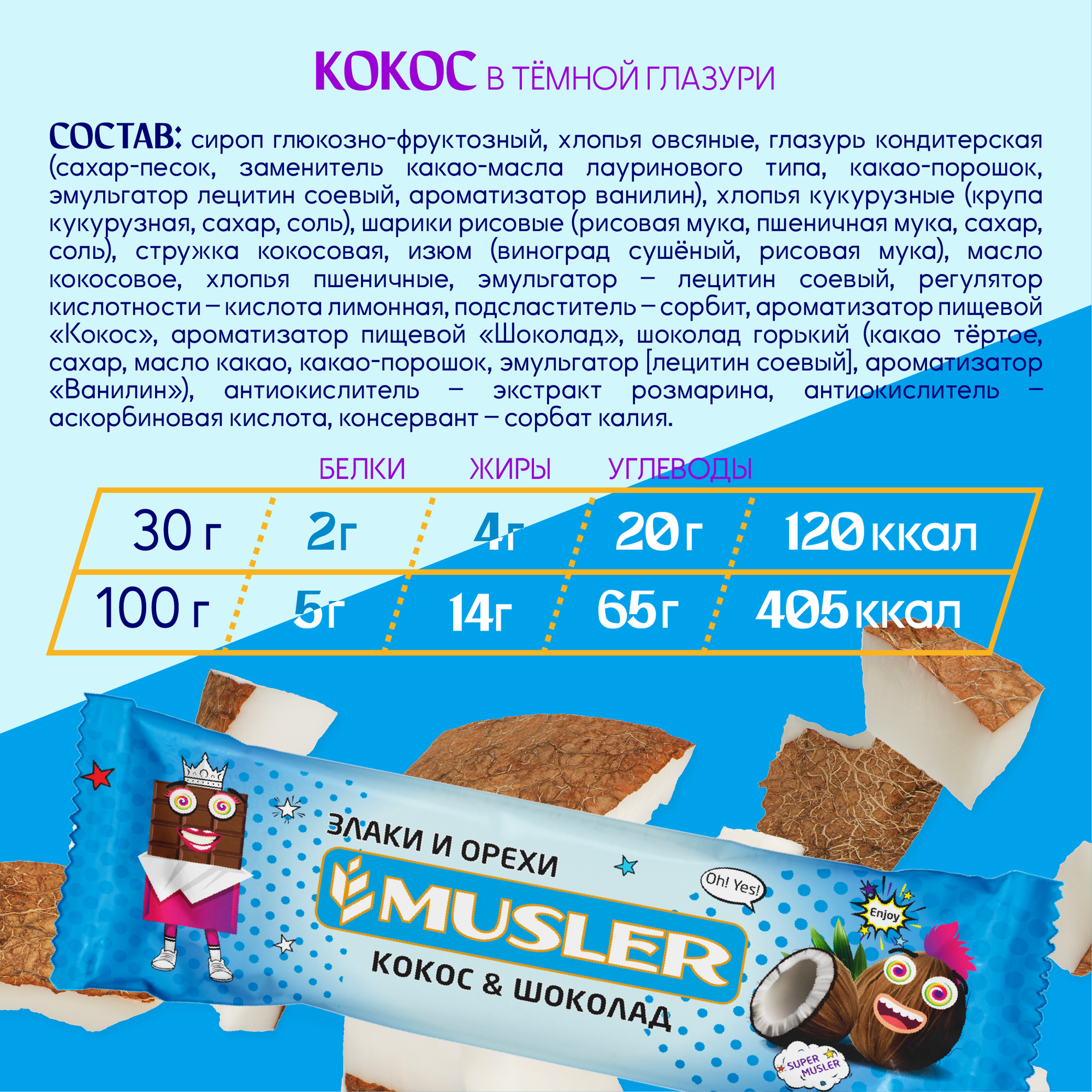 Ореховые батончики мюсли Musler "Кокос и шоколад" 30г (25шт) информация: