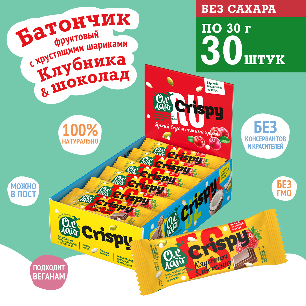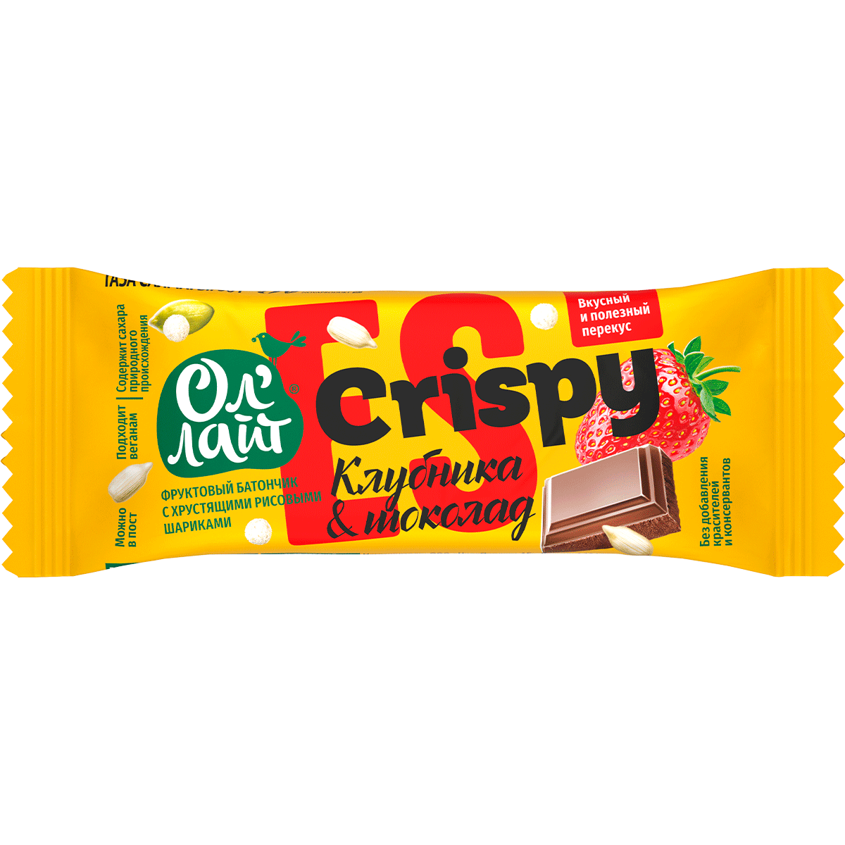 Фруктовый батончик с хрустящими рисовыми шариками, клубникой и темным шоколадом, без добавления сахара информация: