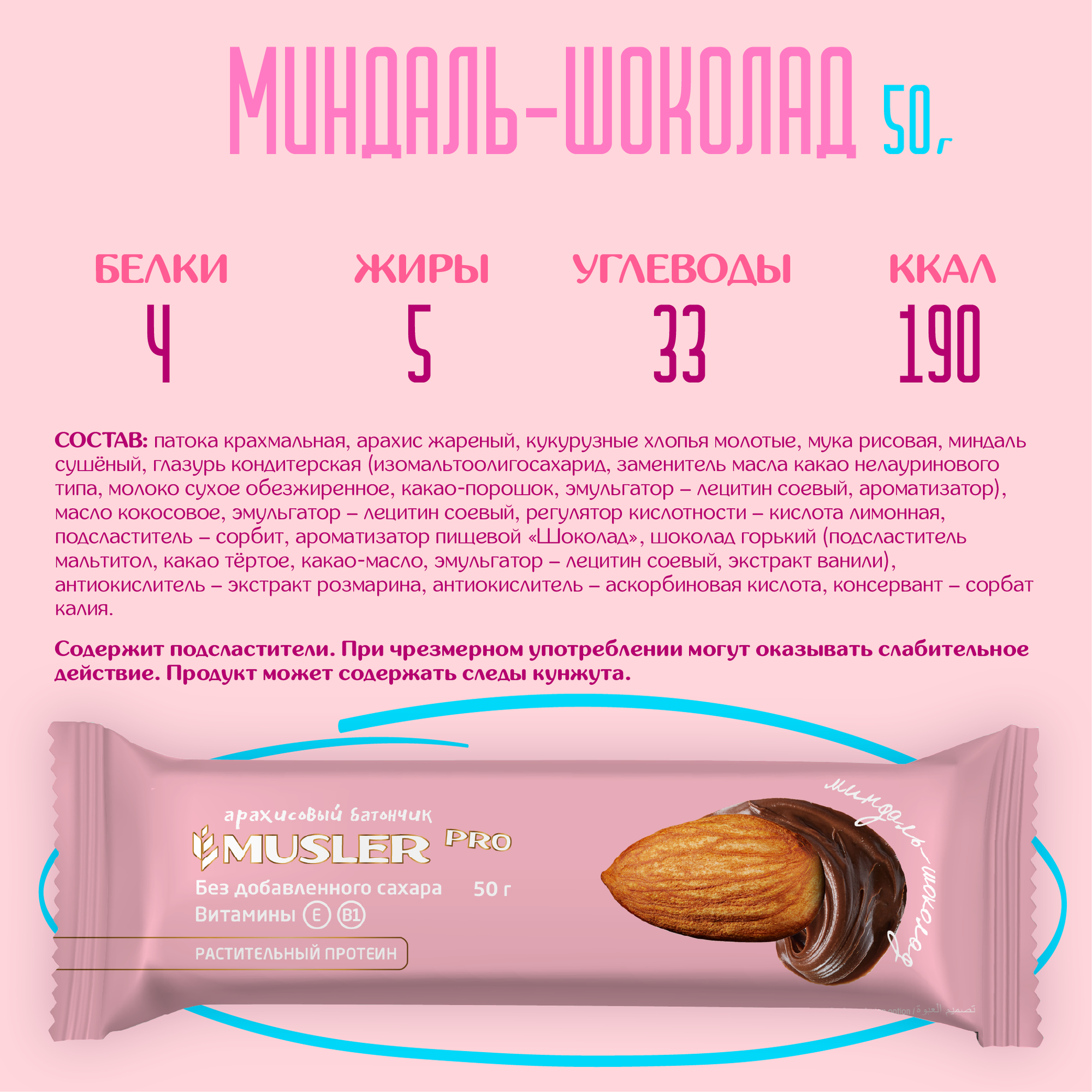 Батончики арахисовые без сахара Musler PRO "Миндаль с шоколадом" 50г (20шт) информация: