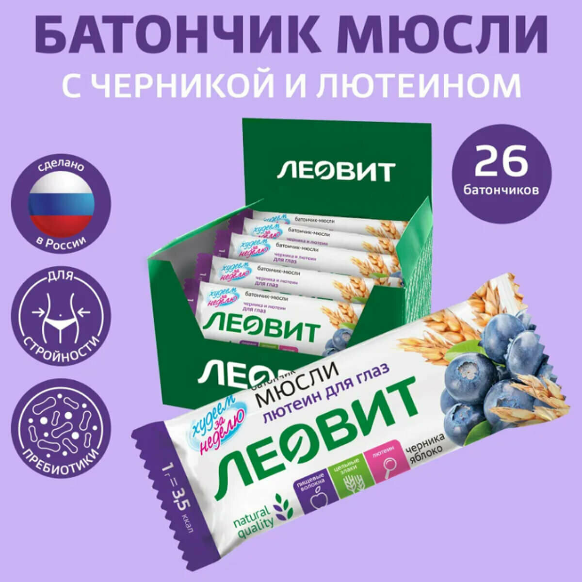 10 цен на Батончик-мюсли с черникой и лютеином, 26 шт по 30 г, леовит
