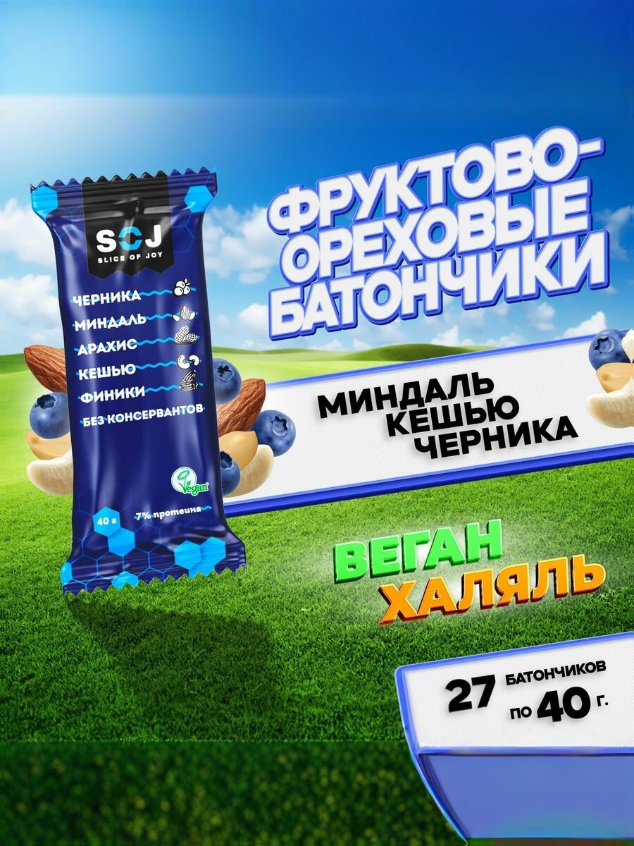 10 цен на SOJ Фруктово-ореховый батончик со вкусом Черники "МИНДАЛЬ-КЕШЬЮ-ЧЕРНИКА" 40г*27шт