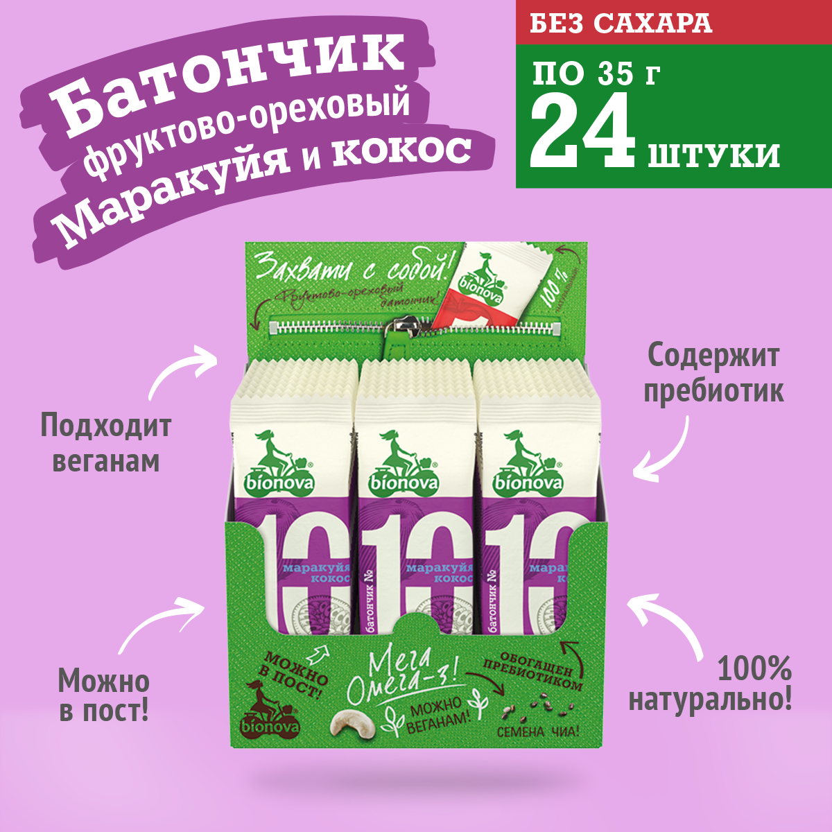 Отзывы на Батончик фруктово-ореховый Бионова с маракуйей и кокосом 35г по 24шт