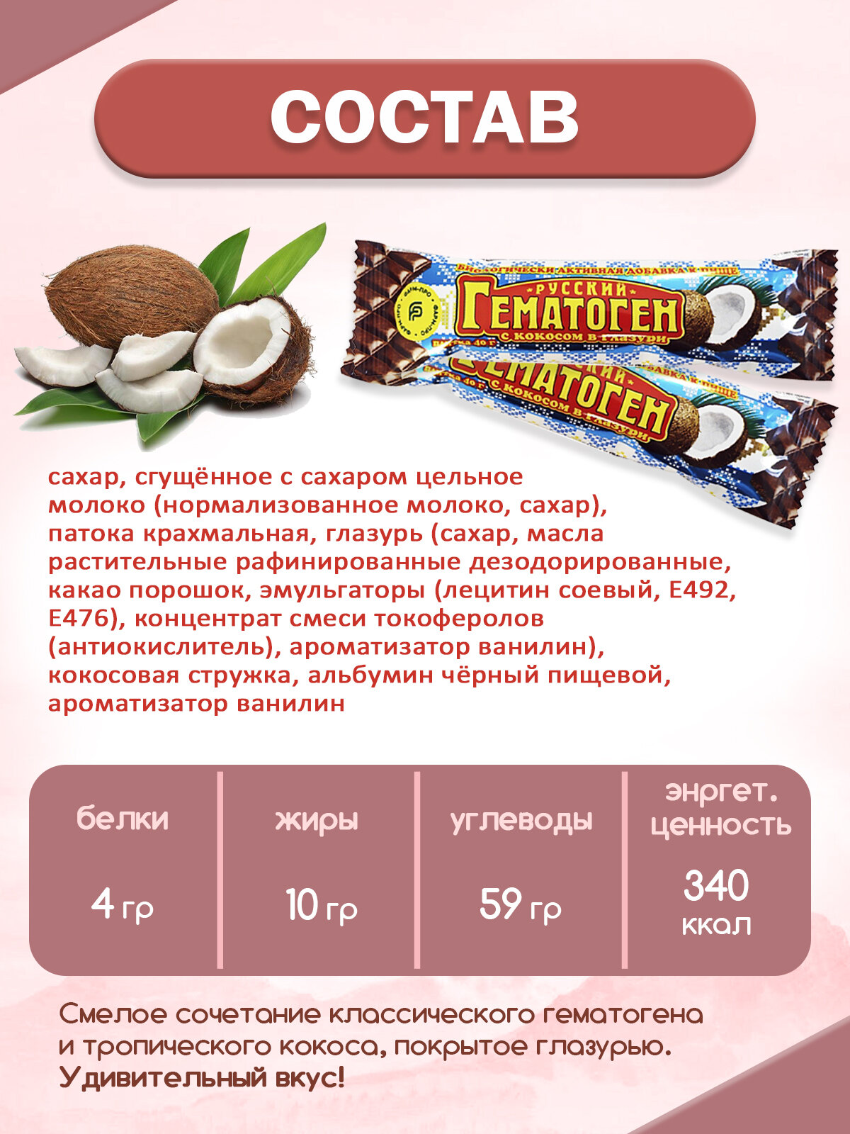 Гематоген Русский (шоколадная глазурь, кокос) 40 г (в наборе 24 шт.) информация:
