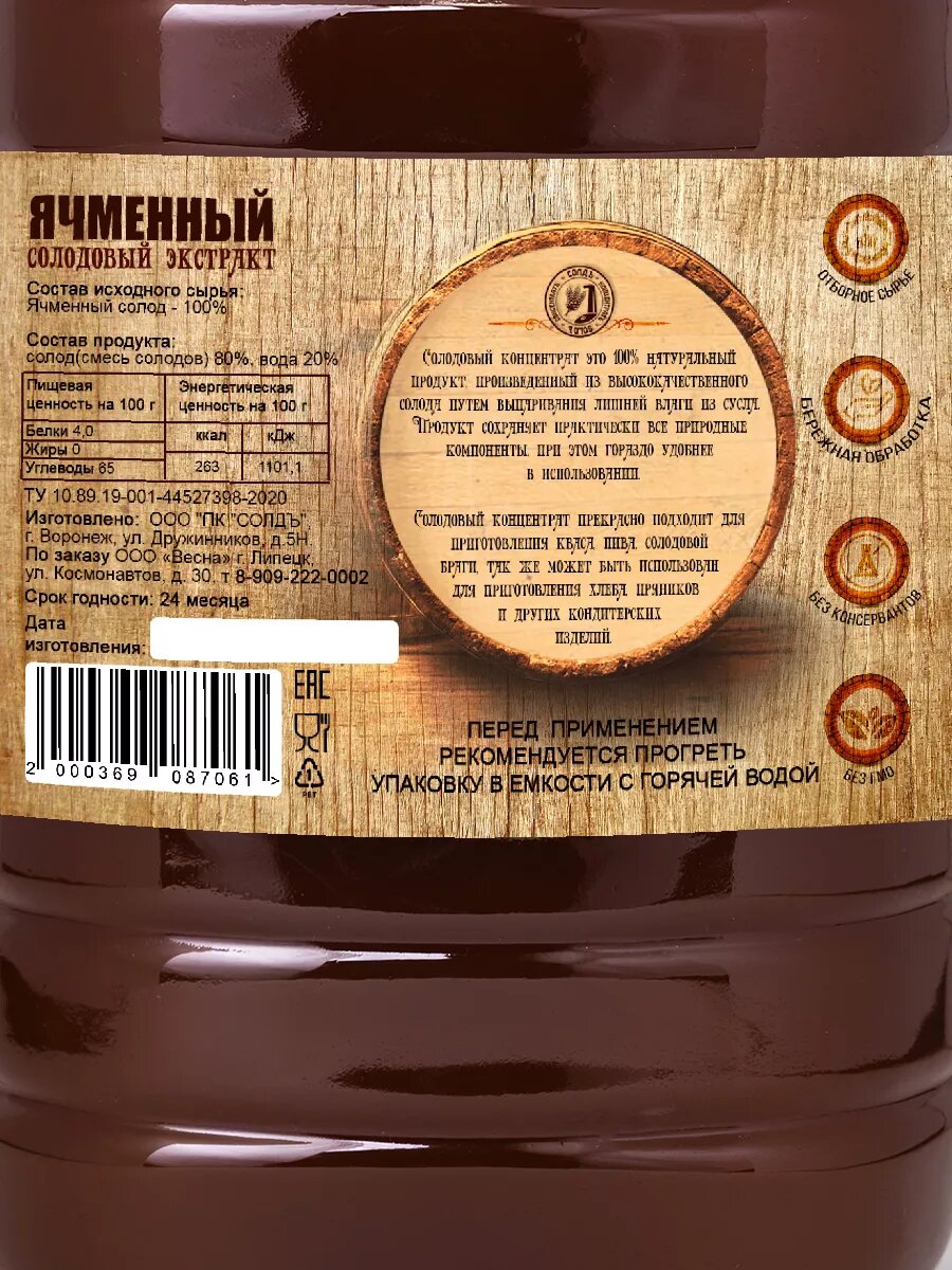 Солодовый экстракт Ячменный 6.9 кг, неохмеленный, для пива, для сусла информация: