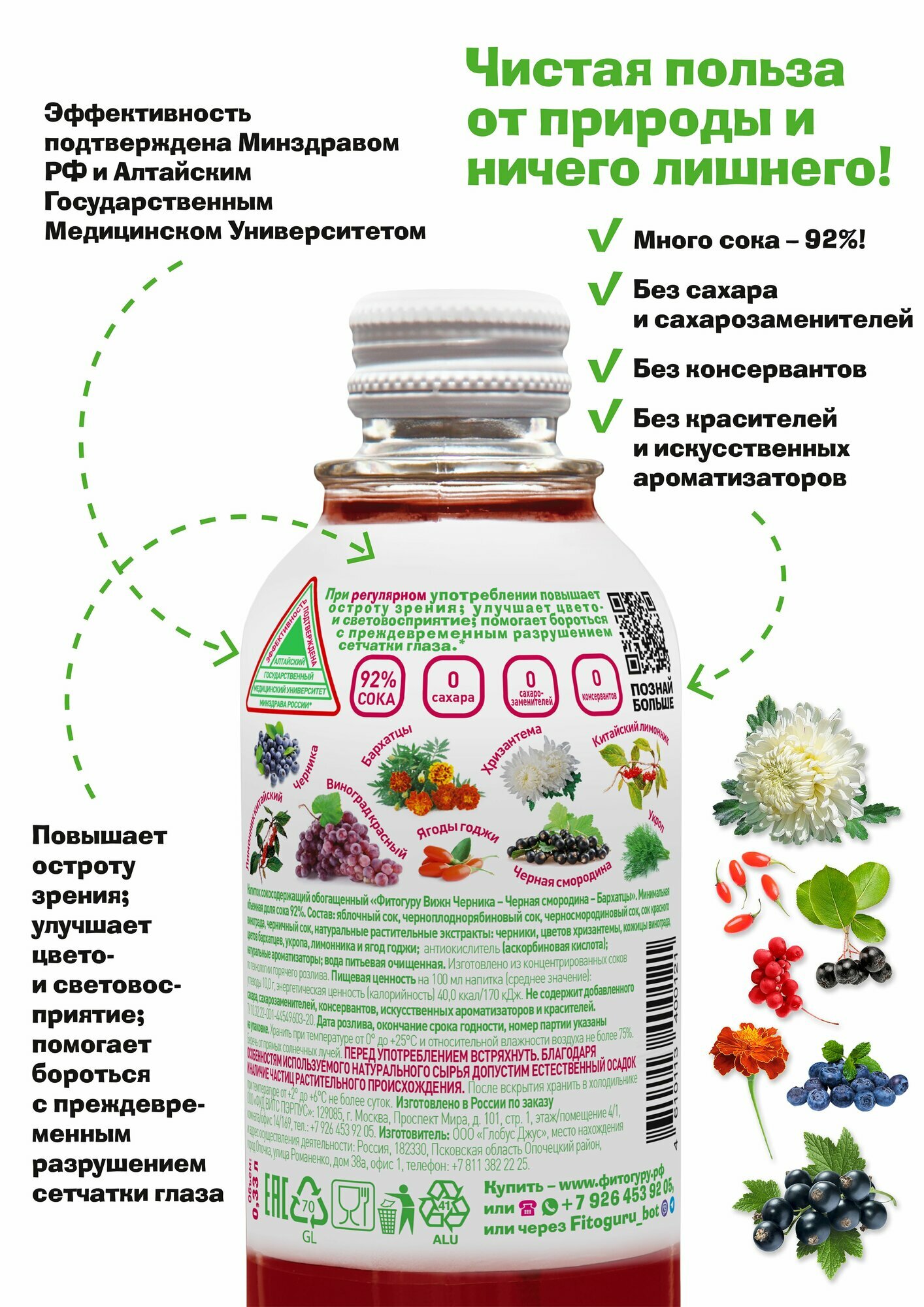 Набор напитков сокосодержащих обогащенных Fitoguru Vision Черника - Черная смородина - Бархатцы, 0,33 мл, ( 12 шт. в уп.) информация: