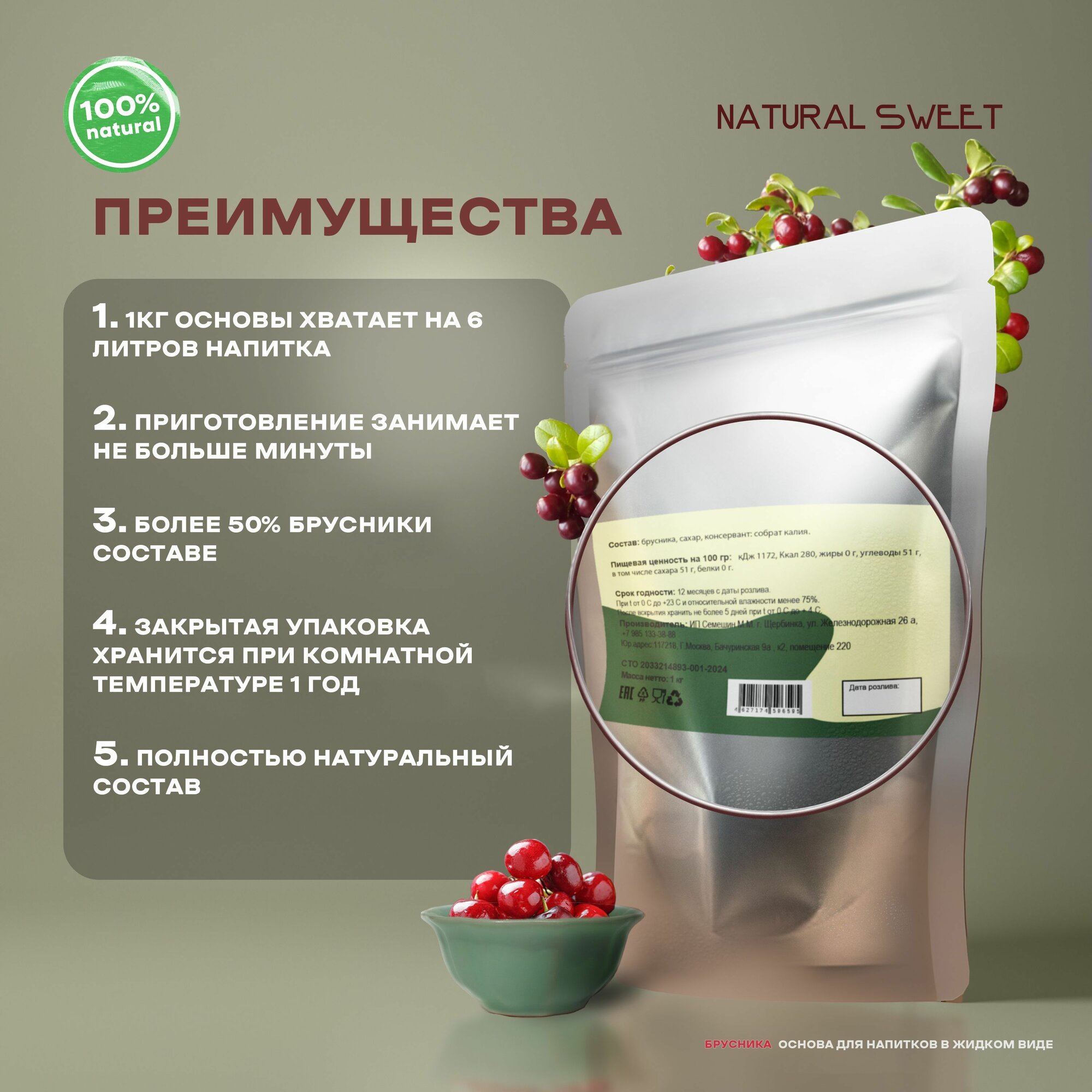 Основа (Концентрат/Пюре) Брусника Natural Sweet 1 кг (для лимонада, чая, коктейлей, десертов, смузи) информация: