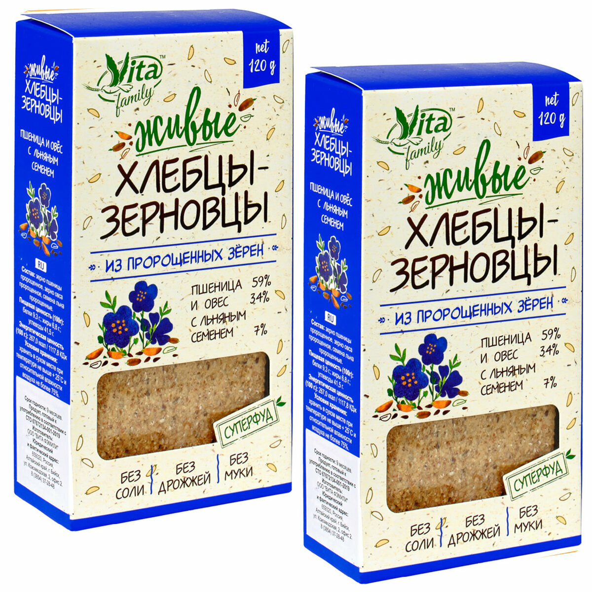 Живые хлебцы-зерновцы. Пшеница и овес с льяным семенем. Из пророщенных зерен. Комплект 2 шт. по 120 грамм, Vita Family информация: