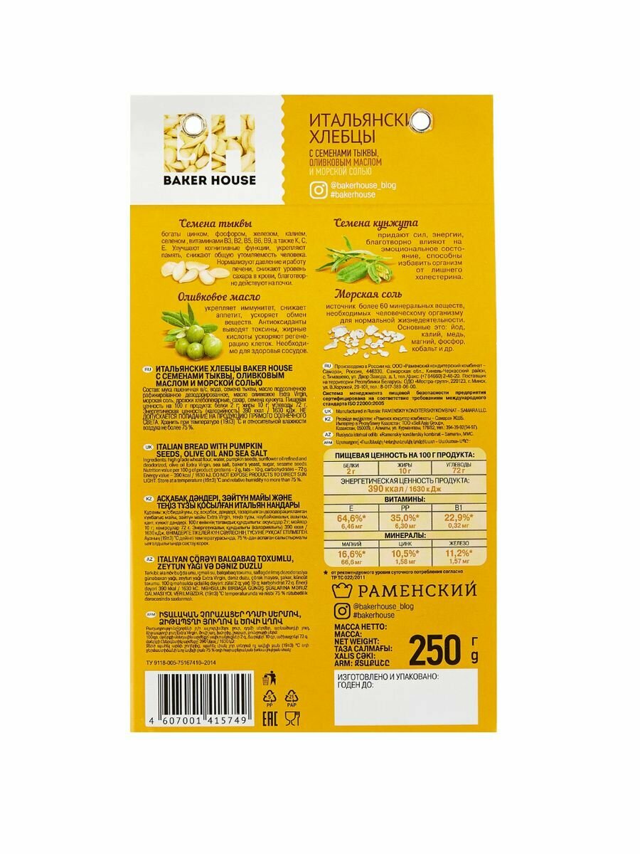 Хлебцы Итальянские с семечками тыквы, 250 г, 7 шт информация: