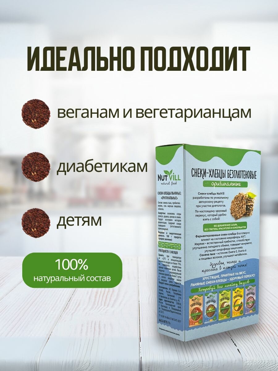 NutVill Снеки-хлебцы льняные Оригинальные без глютена информация: