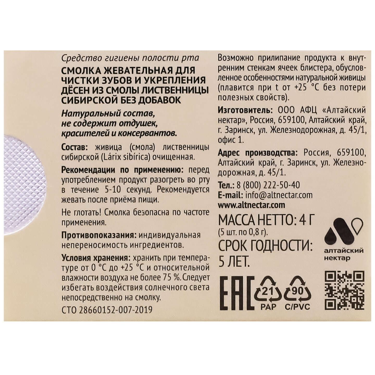 Жевательная смолка Алтайский нектар "Живица ", органический продукт, 5 шт информация: