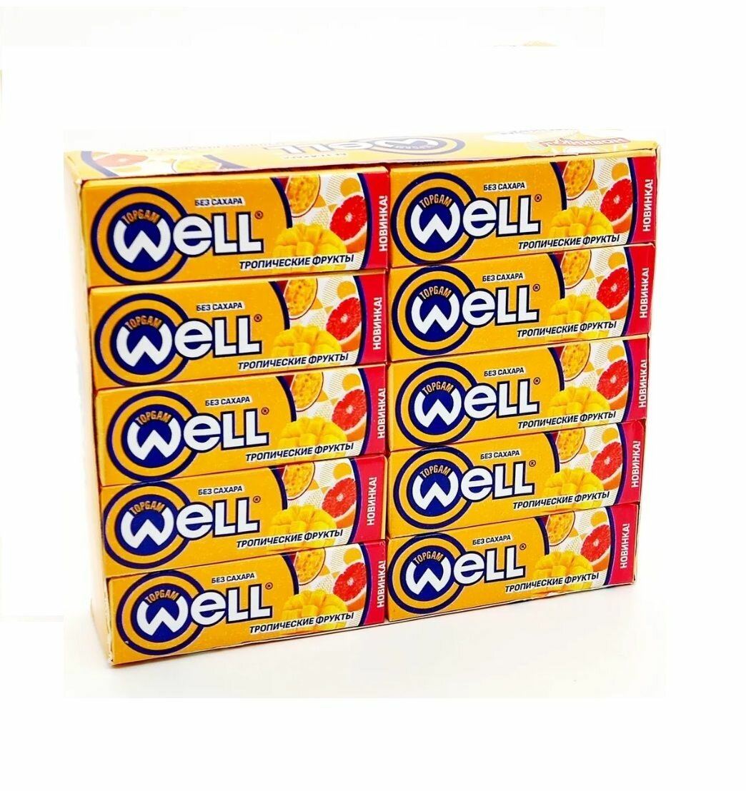 10 цен на Жевательная резинка WELL без сахара со вкусом Тропических фруктов, подушечки, блок 30 шт по 13,2 гр