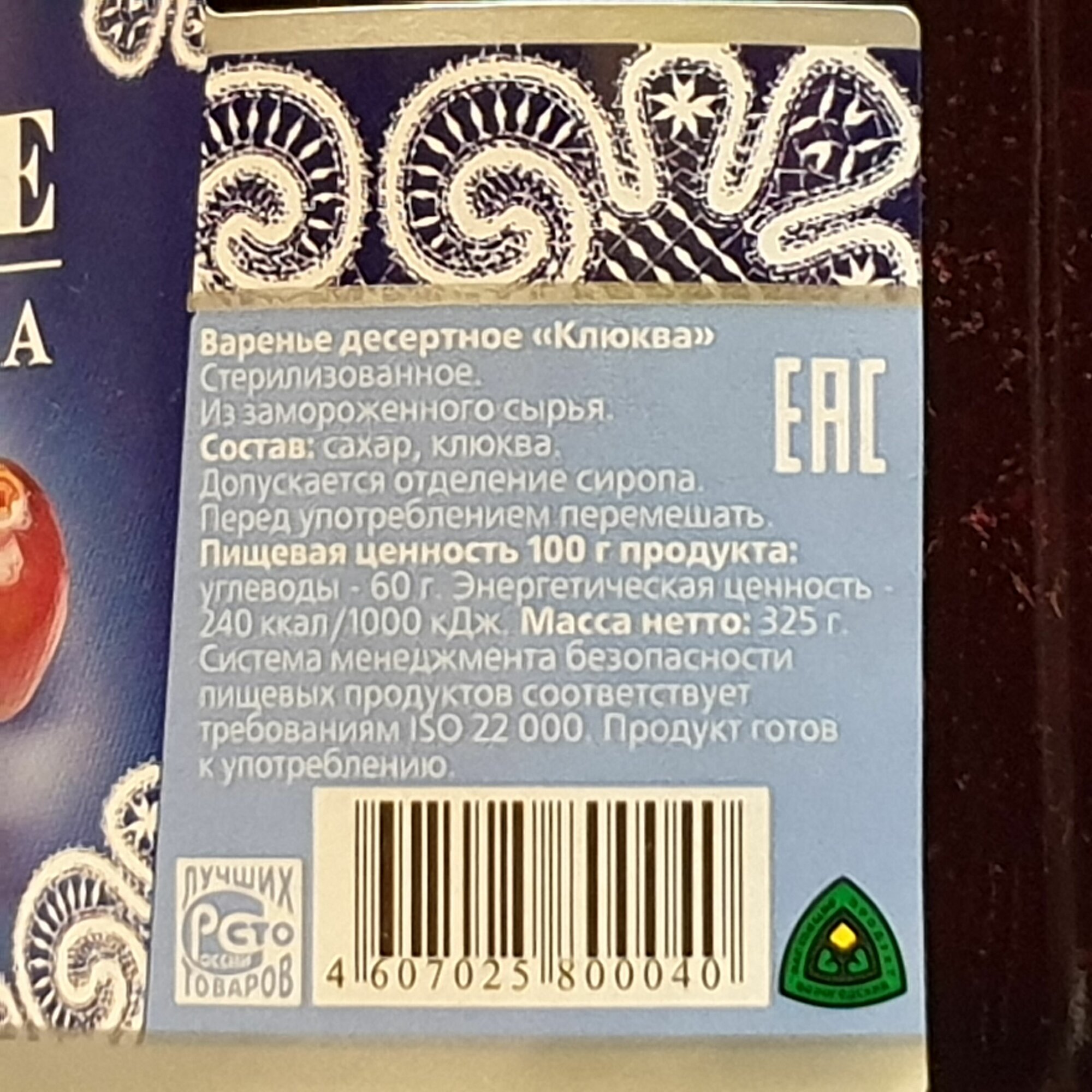 Варенье Клюква ТМ "Экопродукт", 3 баночки по 325гр информация: