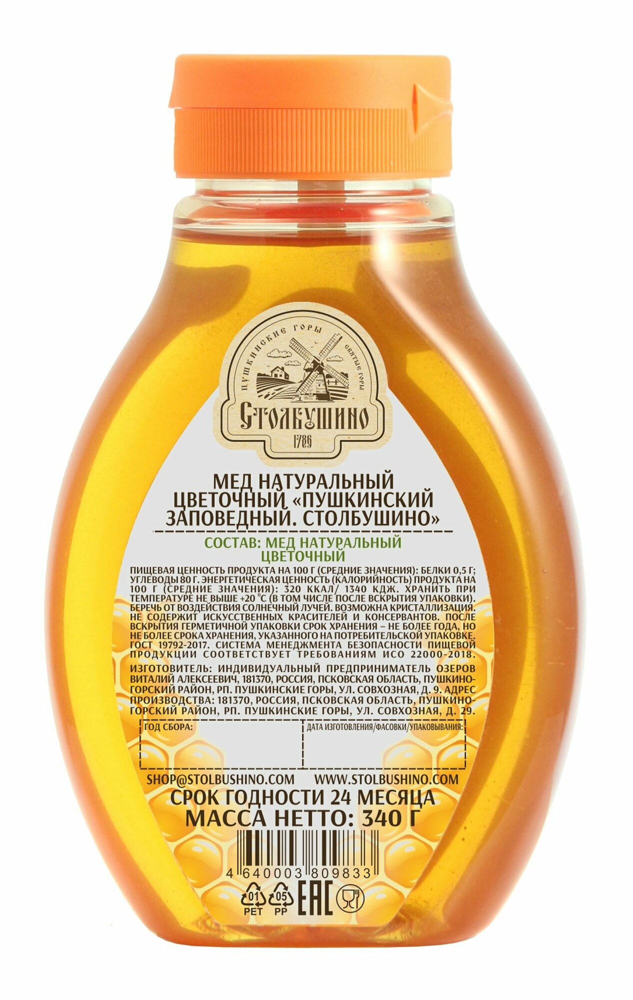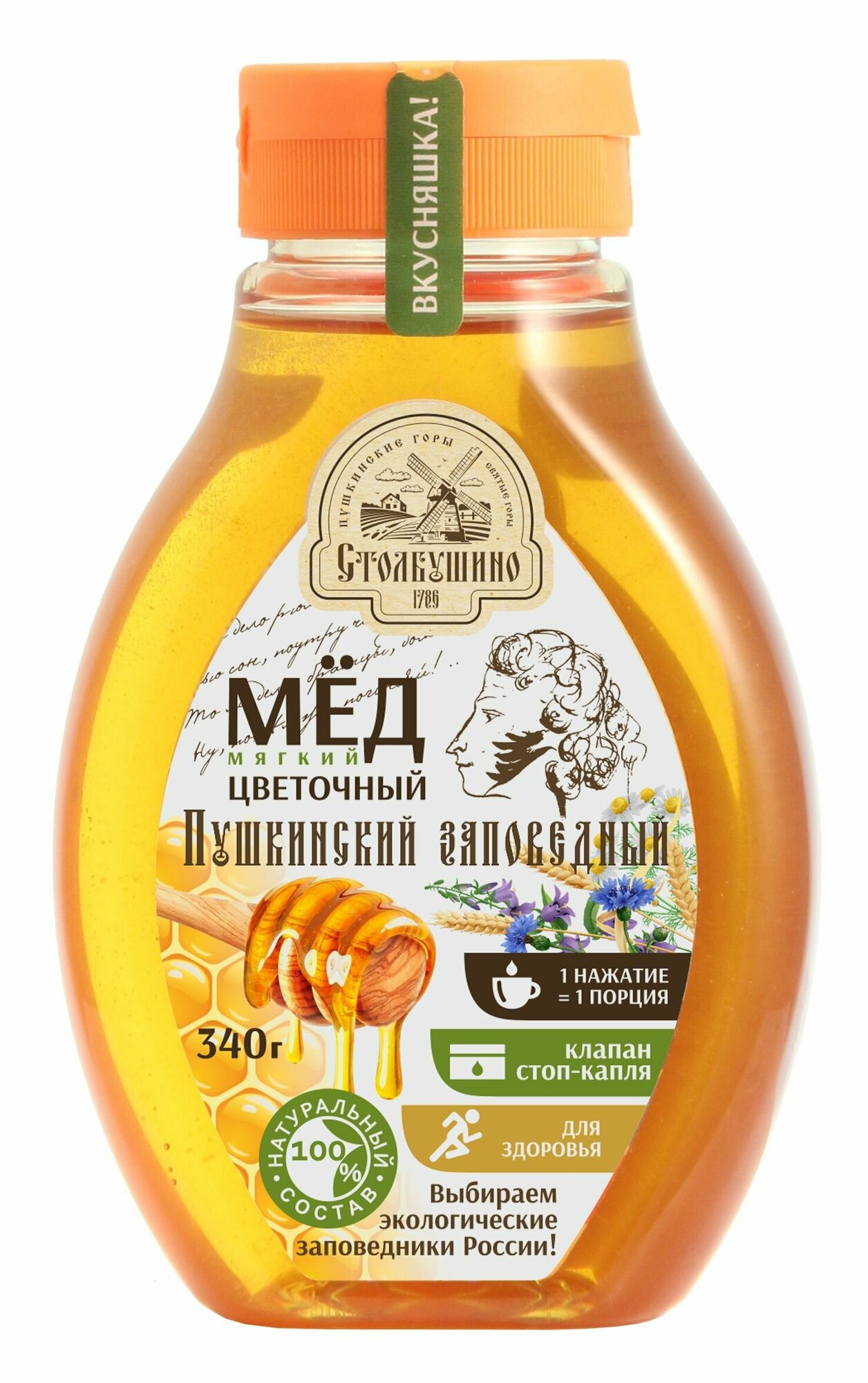 Мёд натуральный цветочный "Пушкинский Заповедный" Столбушино в пластиковой бутылке 340 гр. информация: