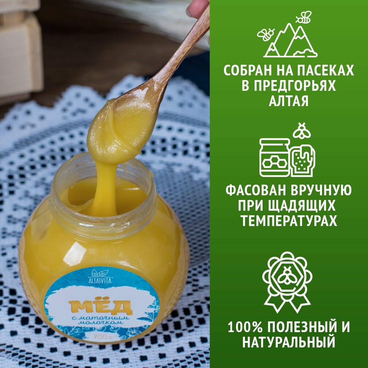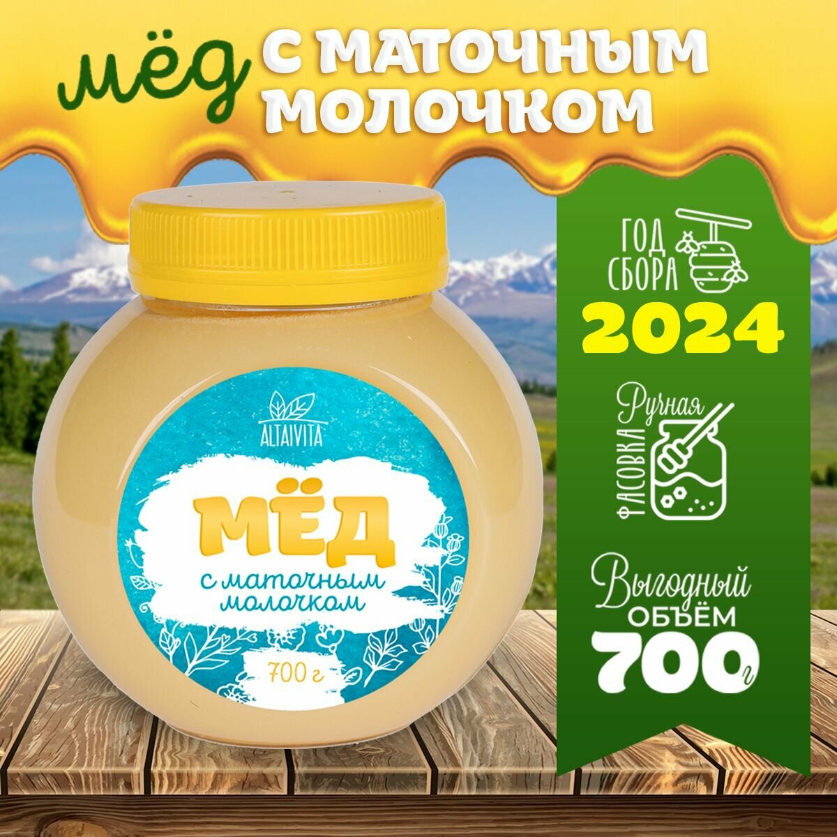 10 цен на Мед с маточным молочком (сбор 2024 года) 700 гр, ТМ АлтайВита