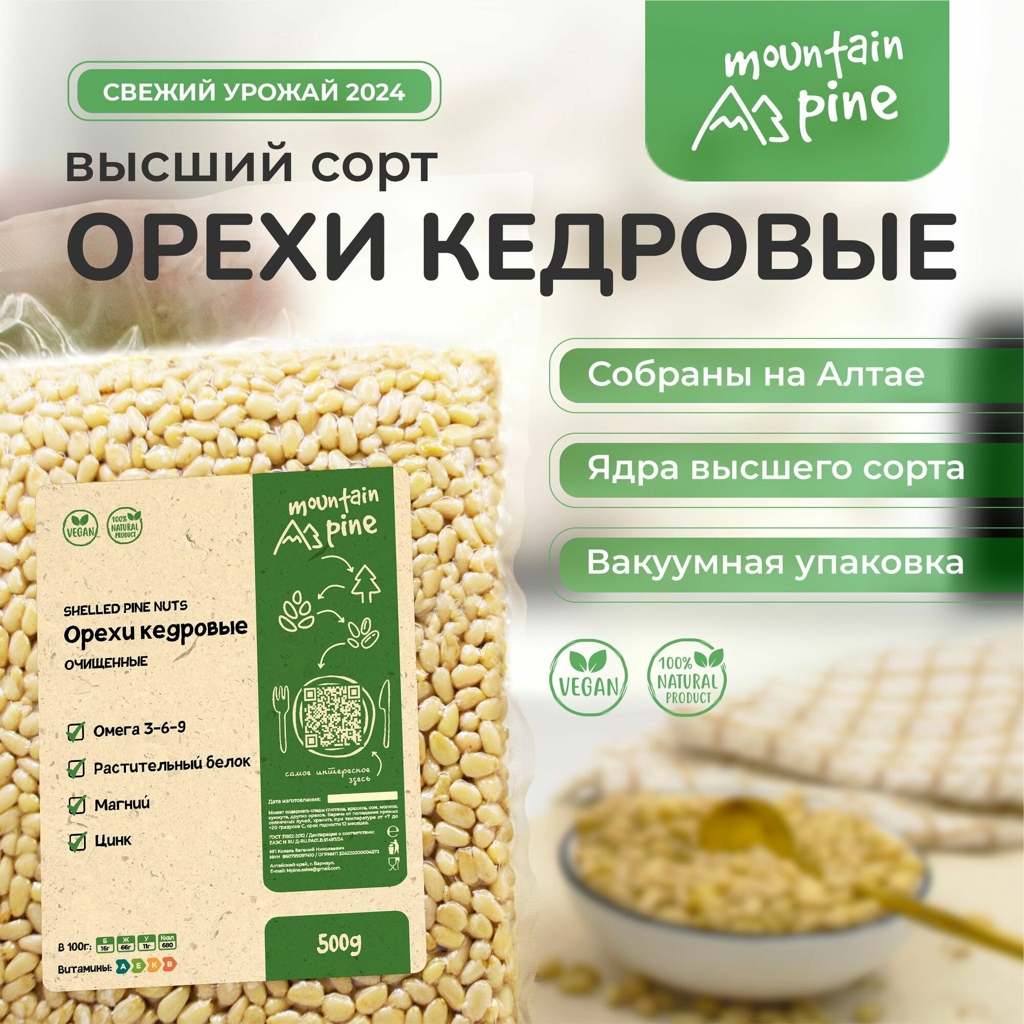Кедровые Орехи "Mountain Pine" Алтай, очищенные, высший сорт, премиум, в вакуумной упаковке, 500гр информация: