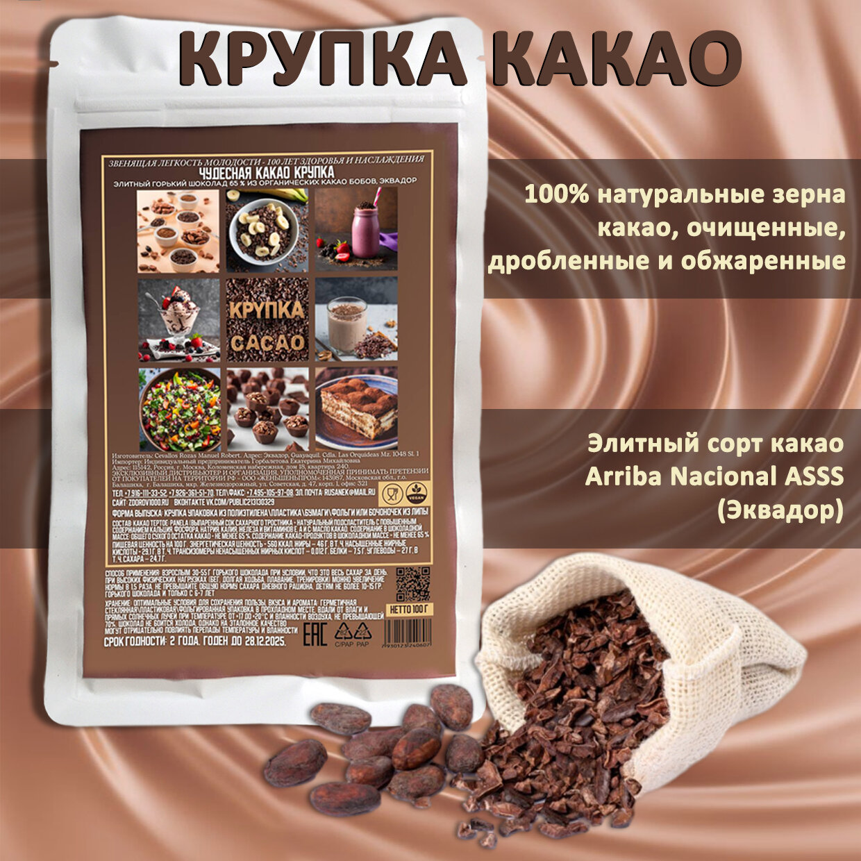 Крупка какао натуральная, премиальный горький шоколад, Эквадор, 100 г. информация: